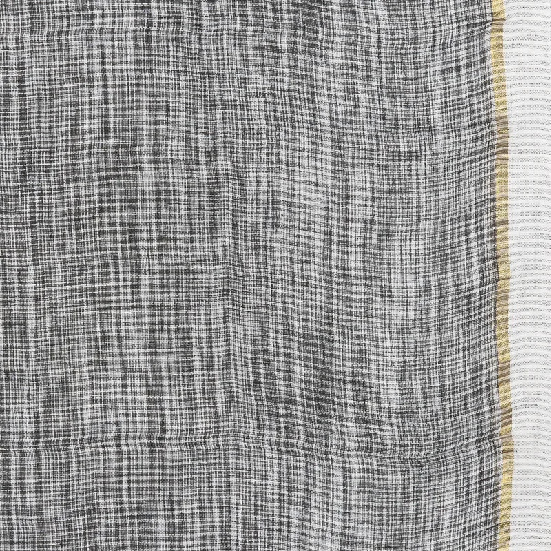 Casual and yet elegant, this shawl is designed by Arnab Roy in India. The black and white shawl is woven from pure linen threads and accented on the long sides with slender lines of golden Lurex. Hand-knotted fringe adorns both ends.