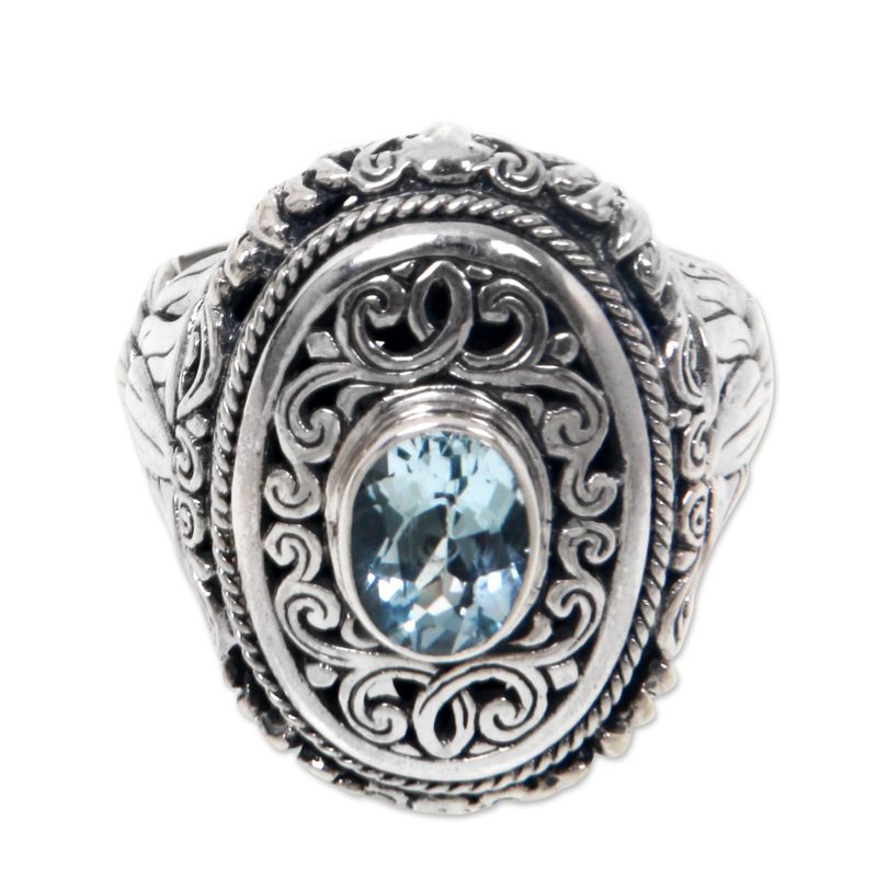 You can find our blue topaz cocktail ring 'Island Blue' by Kadek Hendra in jewelry categories such as Birthstone Rings, Blue Topaz Rings, Silver Rings, Sterling Silver Rings and Single Stone Rings. Enjoy exploring these sections for other Novica treasures.