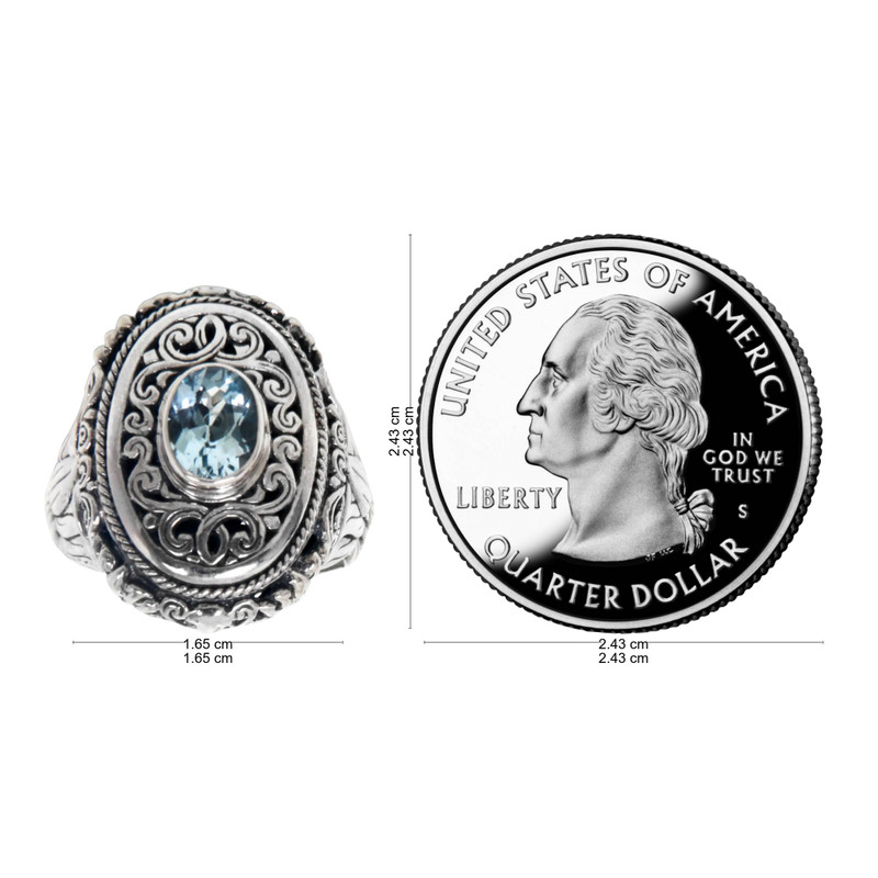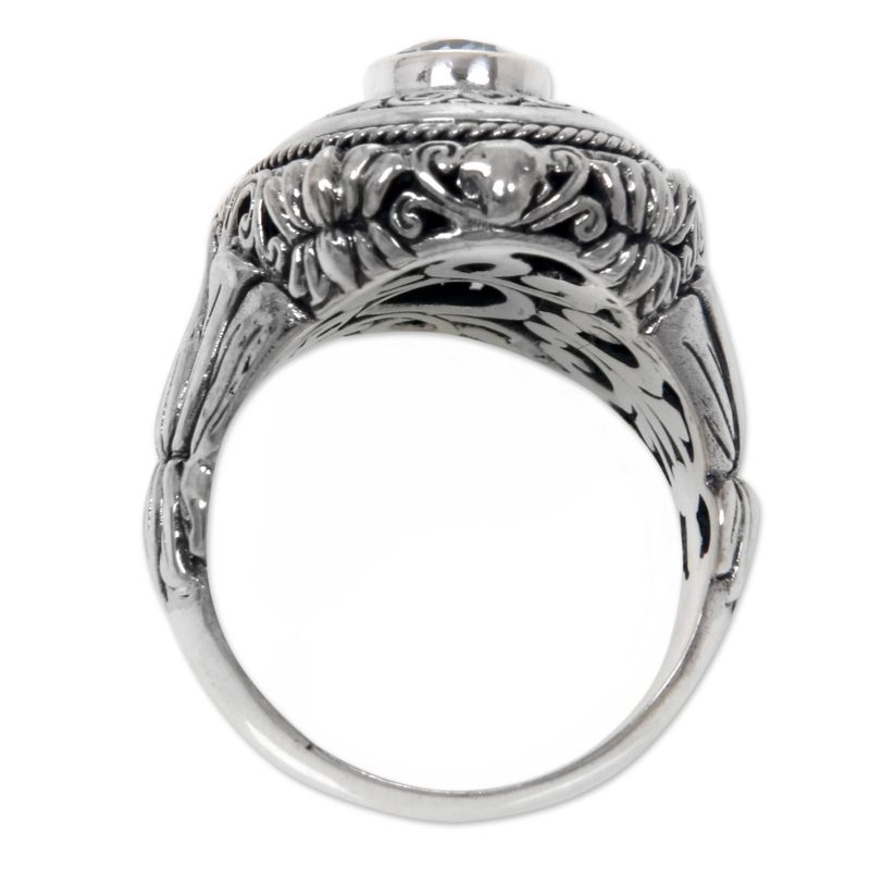 A dreamy crystal-clear lagoon of blue topaz centers this ornate ring from Kadek Hendra in Bali. The ring is hand-crafted from sterling silver and lavished with pretty details, from the rope detail on the crown to the lotus blossoms on each side. The sparkling gem weighs 1.5 carats.