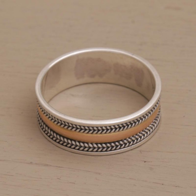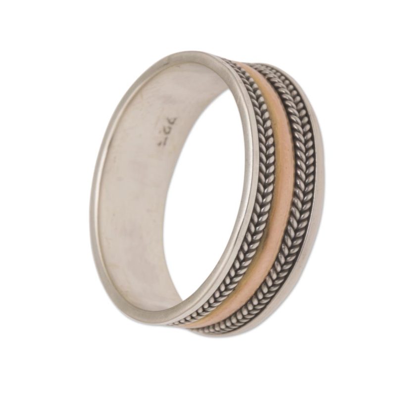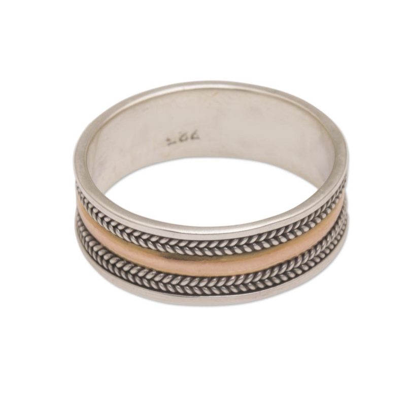 Designed by Balinese artisans, this striking band ring makes an excellent accessory for both men and women. A sterling silver band is detailed with intricate braid patterns as an 18k gold accent carves its way through the center. Komang Wijayana creates this fascinating accessory.