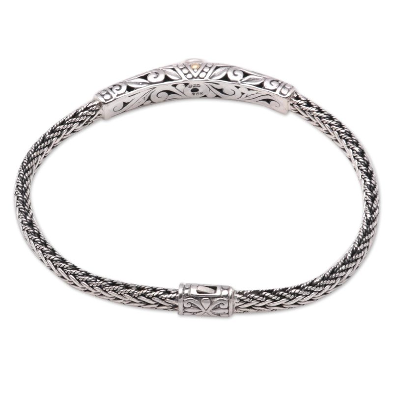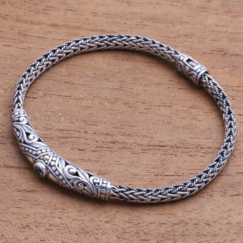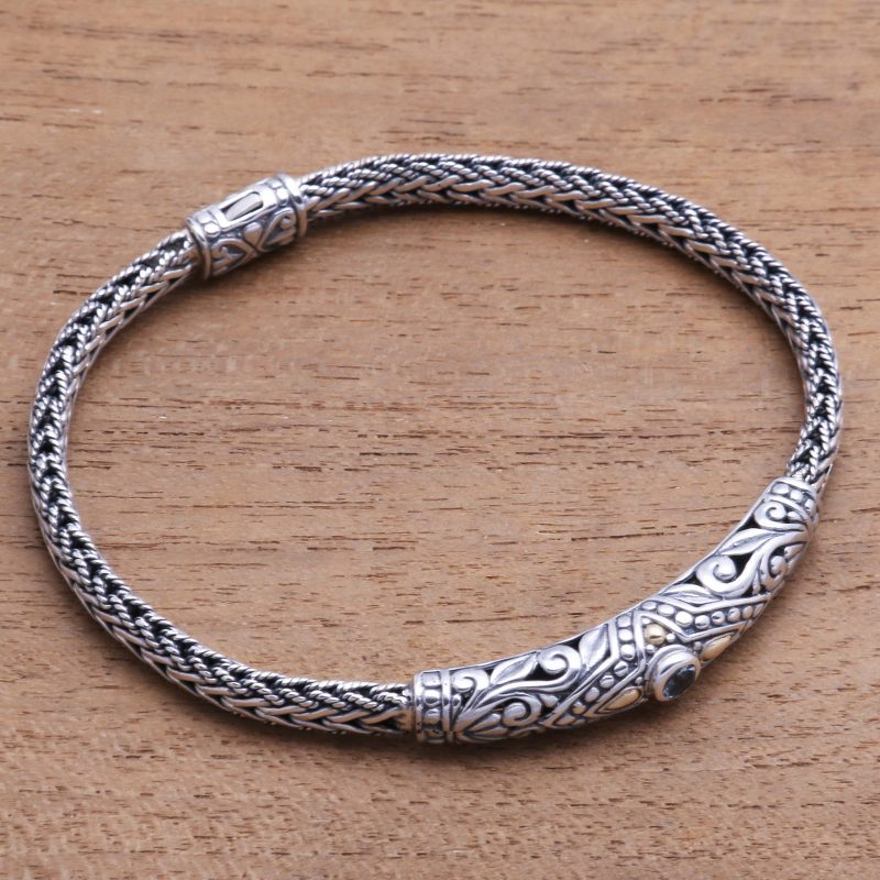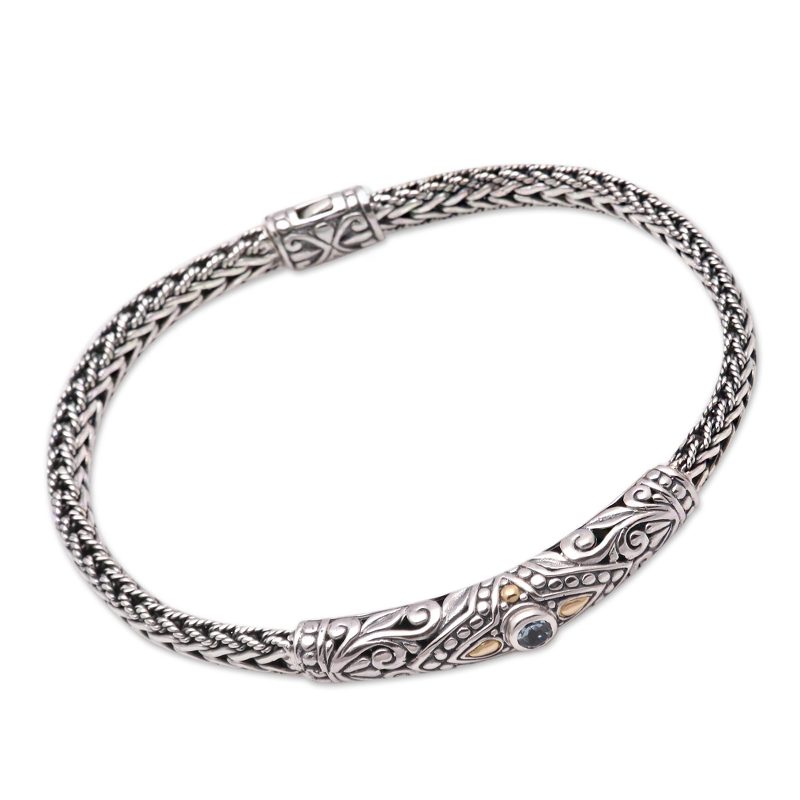 Like a sparkling eye, a single gemstone of blue topaz glitters at the center of this pendant bracelet from Bali. By Wayan Neri, the pendant is detailed with intricate swirl and dot patterns with openwork that exposes a dark interior. Accents of 18k gold gleam beautifully from this bracelet, circling the wrist with sterling foxtail chain.