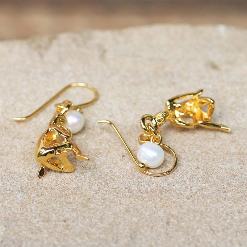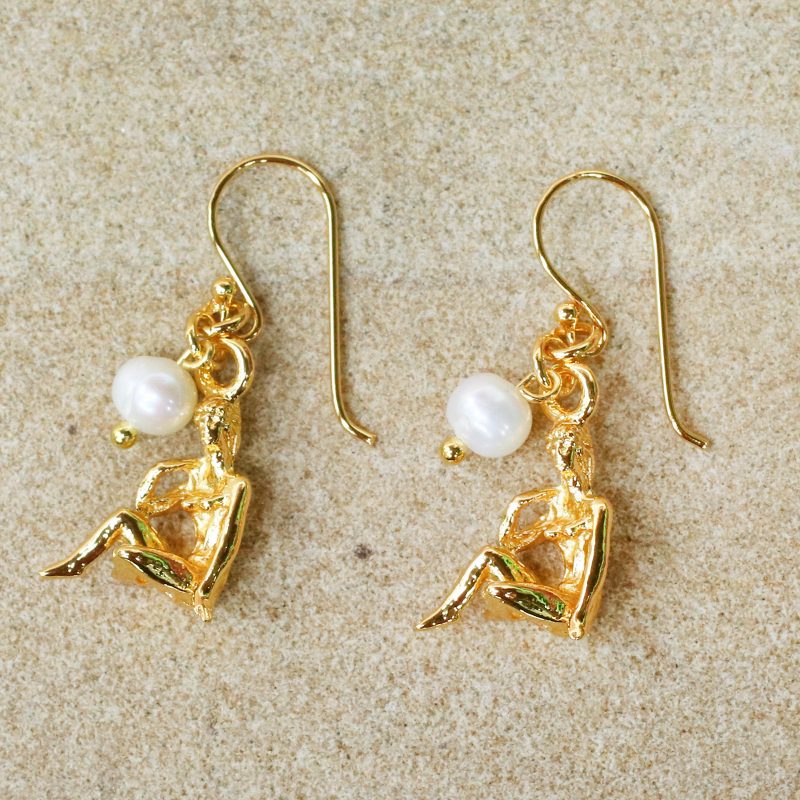 Inspired by the zodiac, Thai artisan Matta designs this pair of dangle earrings to depict the symbol for Virgo. Crafted in 18k gold plated sterling silver, each earring is accompanied by a cultured pearl a beautiful glow. Perfect for expressing your identity, these earrings adorn the ears on hooks.