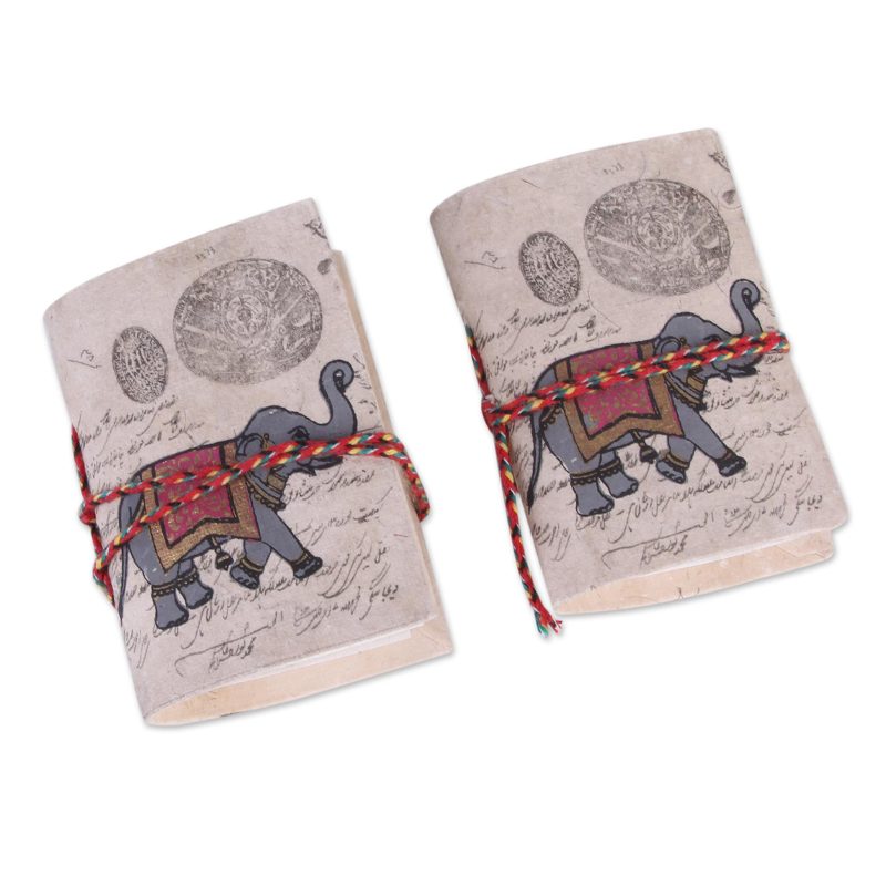 Indian artisan Asha Prabha gives new life to an ancient aesthetic in this luxurious set of two handmade paper journals. On each beige cover is an image of a marching elephant, along with screen-print motifs hearkening back to the stamp paper of the Mughal Court. Inside is 48 pages of clean, off-white writing paper, and each journal is bound by a multicolored cotton cord that beautifully accentuates the rich hues of the cover.