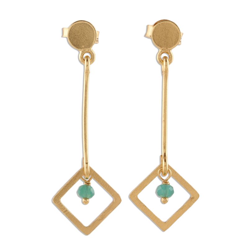You can find our gold plated chalcedony dangle earrings 'Square Dazzle' by Vivek Nathany in jewelry categories such as Geometric Earrings, Gemstone Earrings, Modern Earrings, Chalcedony Earrings and Silver Earrings. Enjoy exploring these sections for other Novica treasures.