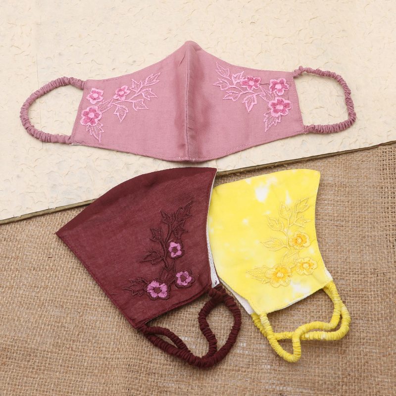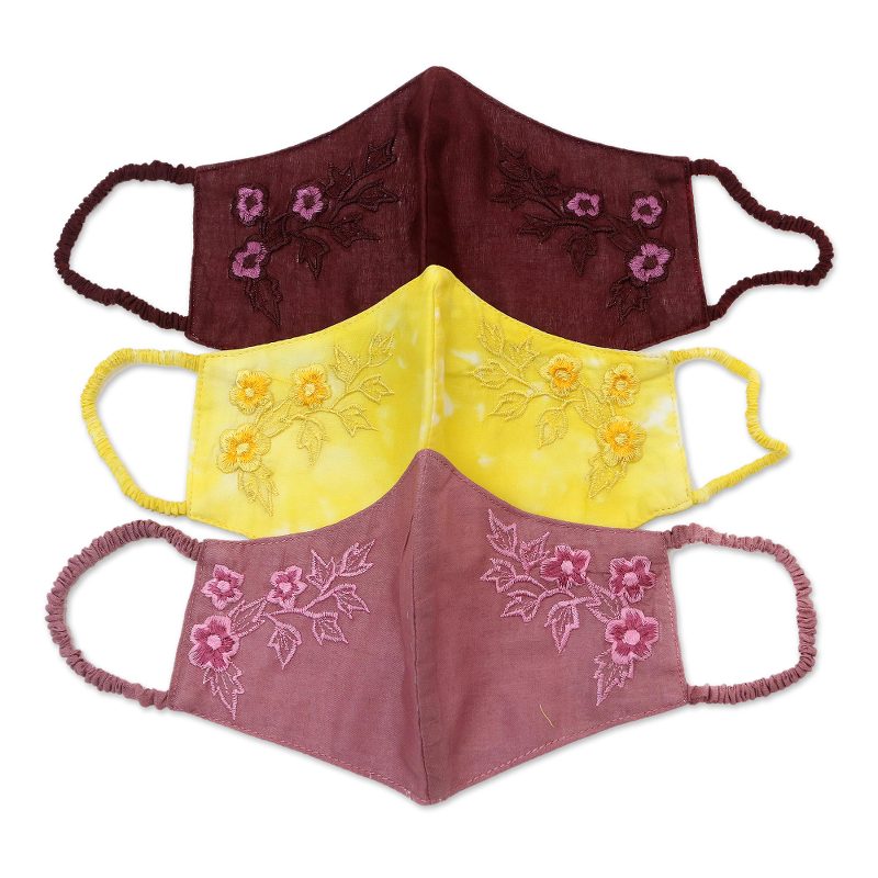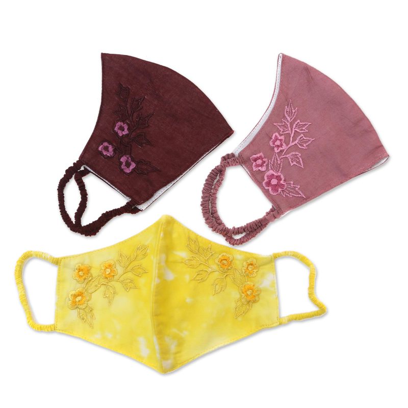 Lavish floral embroidery brings a touch of beauty to cotton face masks from Bali. Made Suciati crafts the contoured masks in pink, burgundy, and a yellow print with covered elastic that loops around the ears. They are triple-layered yet lightweight for breathability, and are both washable and reusable.