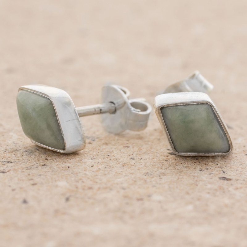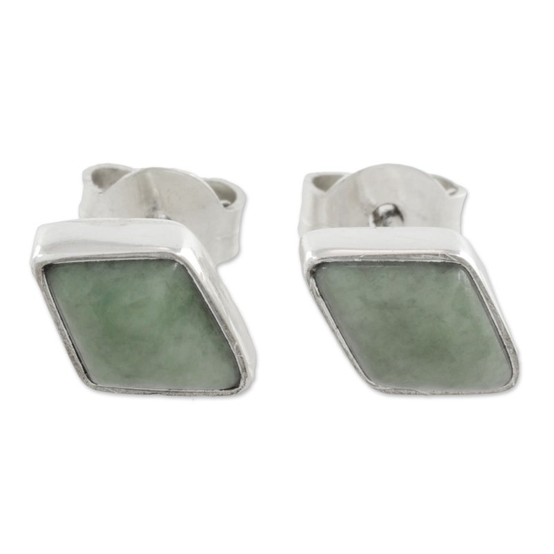 Guatemalan artisan Zandra Lorena Sajbin works in the style of Mayan jewelry, designing this pair of elegant stud earrings. Handcrafted of sterling silver, each earring features a diamond-shaped stone of natural jade with light green hues.