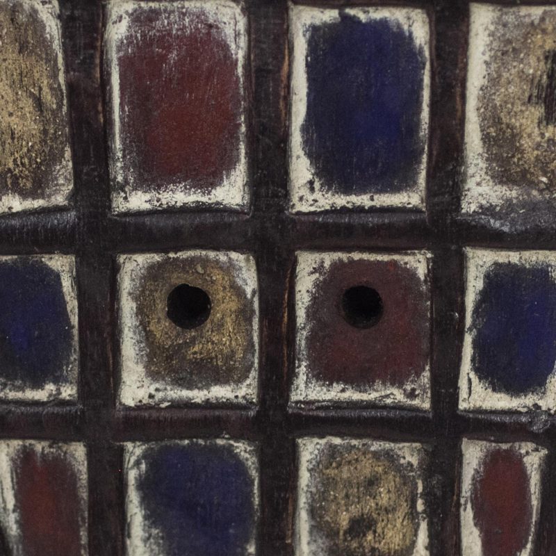 Salihu Ibrahim creates an impressive replica of the bridal mask worn by the Mandey people from Cote d'Ivoire. It is worn to ensure the newlyweds will have children. They believe that by keeping their faces hidden during the marriage ceremony they are protected from the evil eye possibly cast by any of those attending. Ibrahim grounds stones and charcoal to obtain the colors used for decorating the sese wood mask. This mask is known as "Sowei," which in the Gola language of the Mandey means "Give Birth."