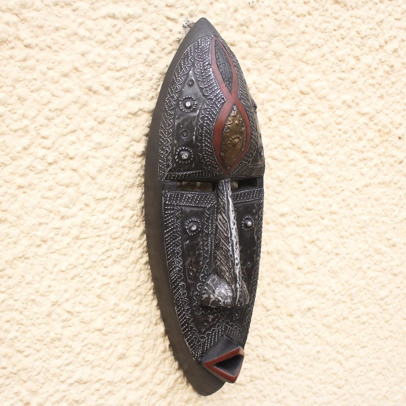 He speaks with the voice of wisdom and learning and all who hear him heed his words. By Godfred France, this elegant mask is crafted by hand, combining African sese wood with brass and aluminum. He names his original design Dankurugu, a Hausa word meaning "Knowledge."