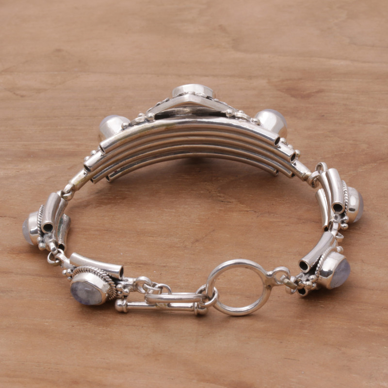 Elegant links are crafted of sterling silver, circling the wrist with rainbow moonstones in this bracelet from Bali. Buana designs the bracelet, centered by a pendant that depicts beautiful jepun, or frangipani flowers, fitted with a three-carat amethyst stone.