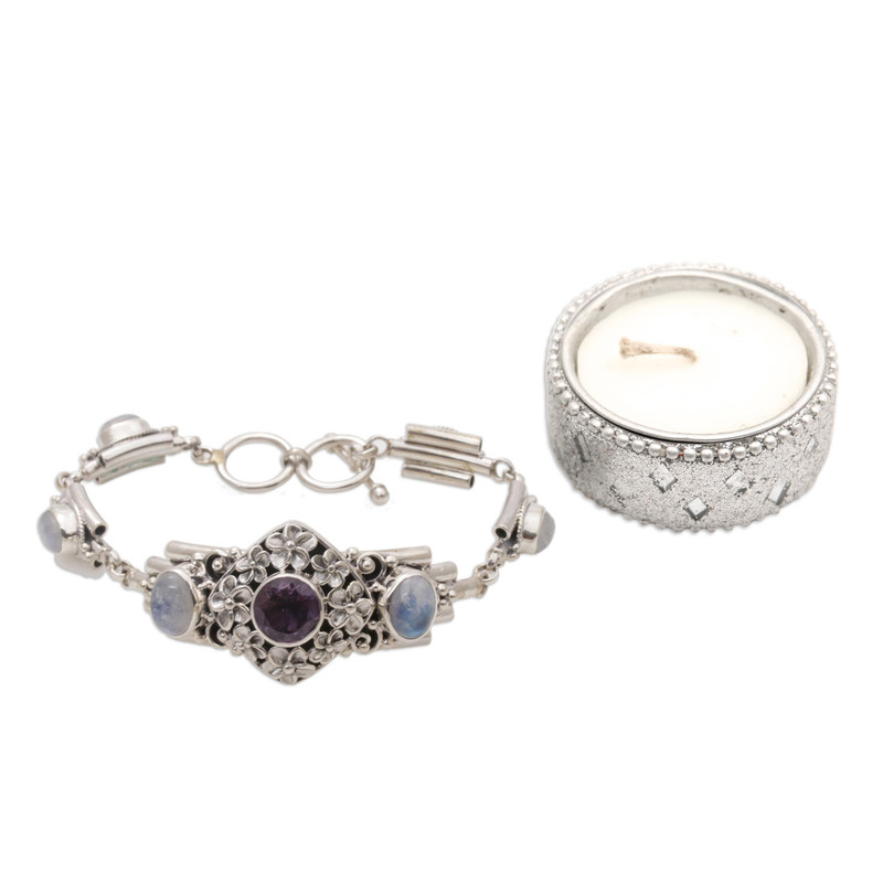 You can find our amethyst and rainbow moonstone pendant bracelet 'Jepun Goddess' by Buana in jewelry categories such as Floral Bracelets, Rainbow Moonstone Bracelets, Sterling Silver Bracelets and Pendant Bracelets. Enjoy exploring these sections for other Novica treasures.