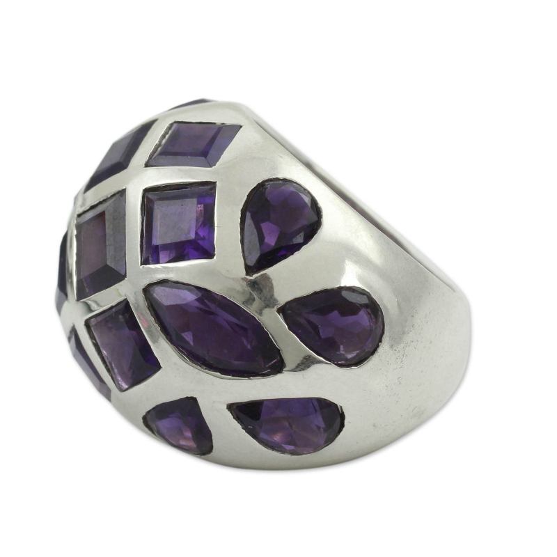 Faceted amethysts in a variety of shapes find a showcase in a sterling silver dome. From Alok Jain in India, this stunning ring features gemstones that total 14 carats.