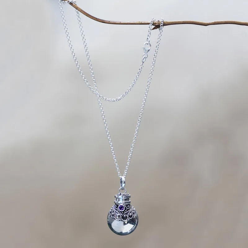 An amethyst sparkles on a pendant of ancient splendor. Crafted of sterling silver, the pendant is crafted in the shape of the classic arak bottle, designed for a liqueur fermented either from coconut palm flower, or from black glutinous rice and coconut milk. Sukartini presents the ornate bottle pendant, which opens, on a rollo chain.