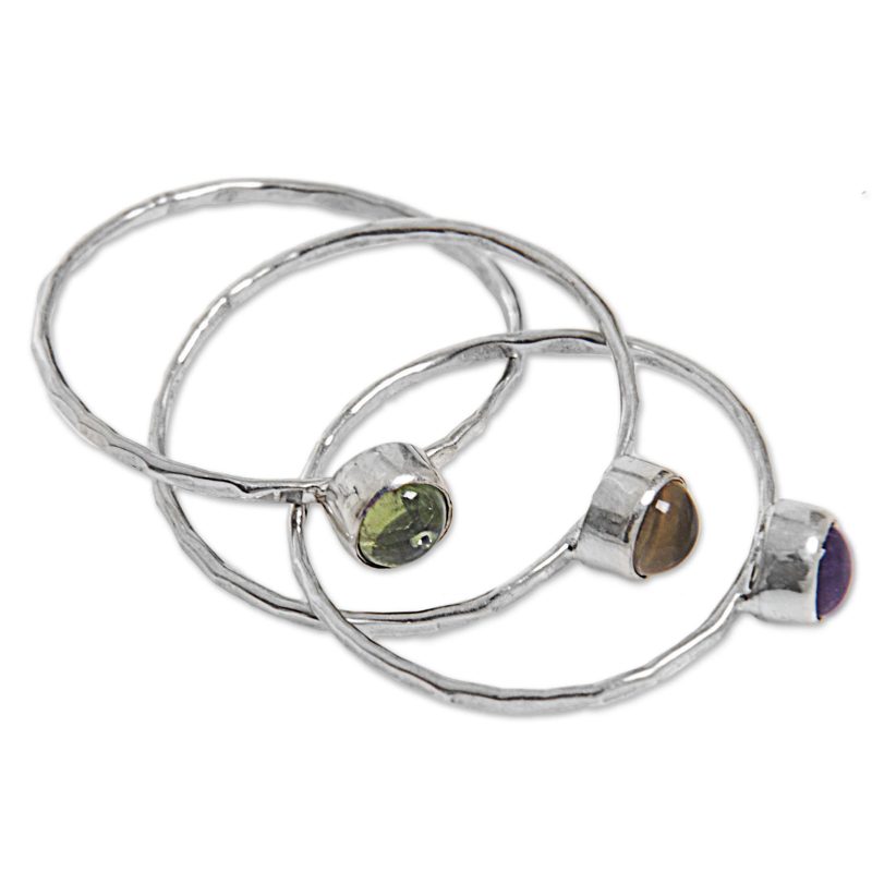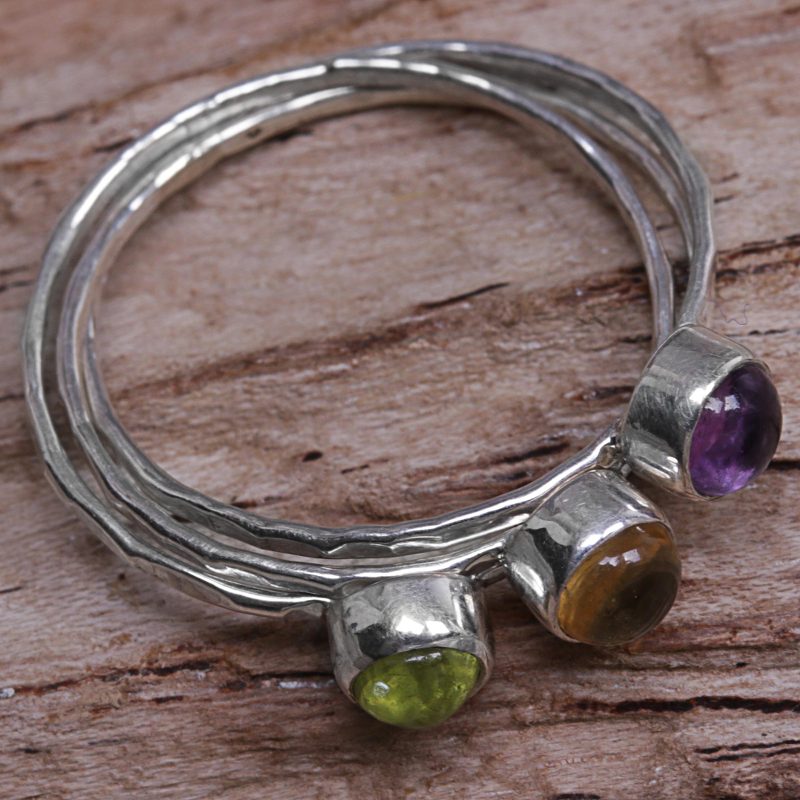 Stones of amethyst, peridot, and citrine achieve a sleek, yet complex look atop this multi-stone ring. Indonesia's Ketut Sulastri designs it with three interlocking bands that are handcrafted from hammered sterling silver.