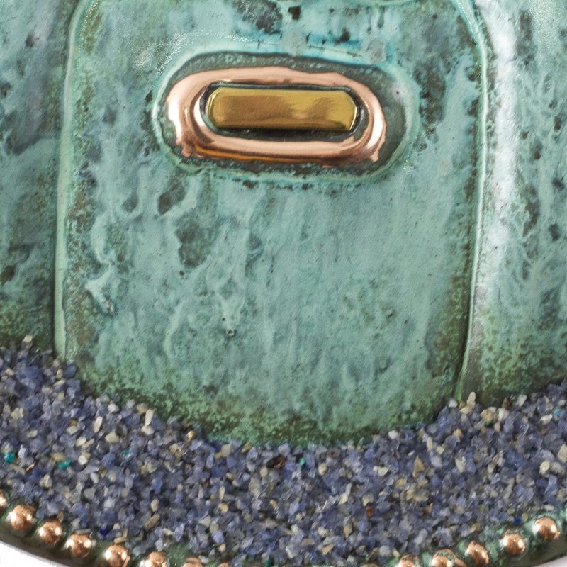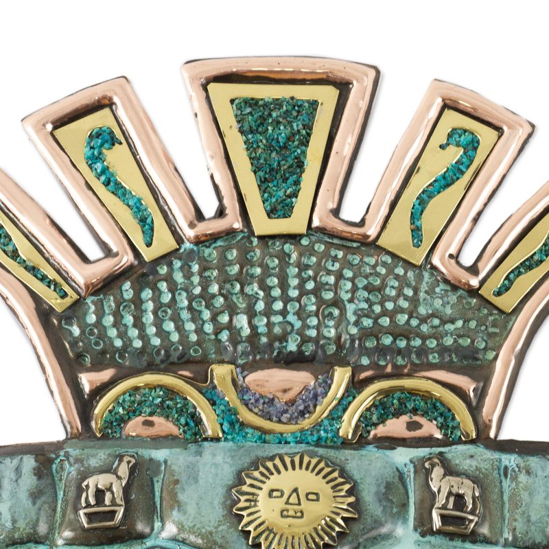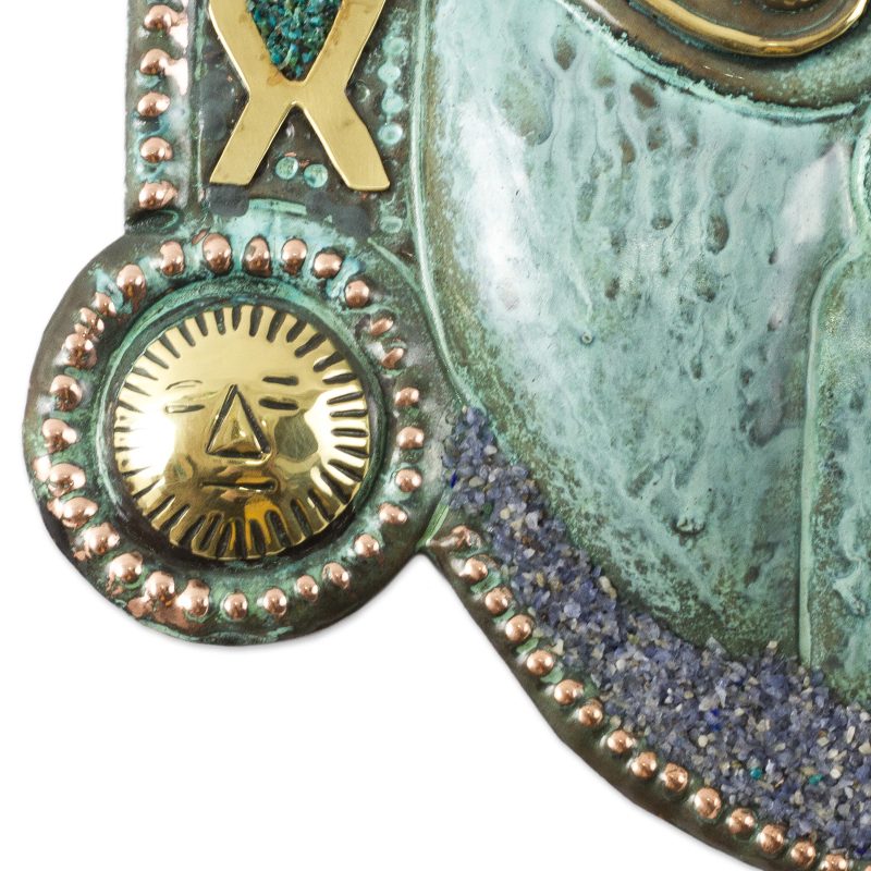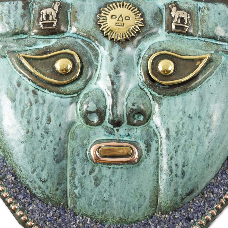 Depicted in a dramatic mask, the Moche deity Ai Apaec is the fierce god of creation. He protected the Moche people, provided water, food and military triumphs. Working in copper and bronze, Ronald Franco commemorates the deity both feared and worshiped by ancient Andean peoples. Applications of chrysocolla and sodalite add rich textures.