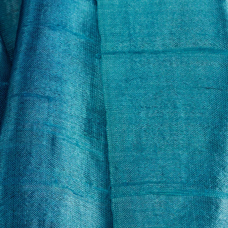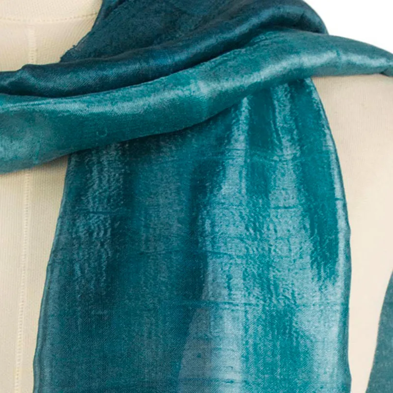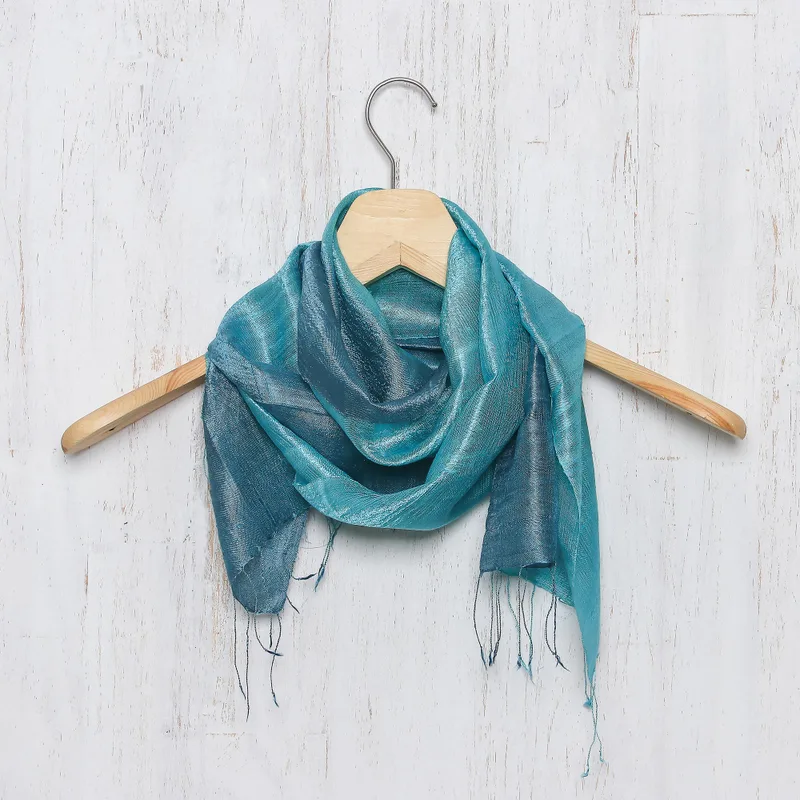 This bold hand woven scarf is presented by Thai artisan Vinita. She dyes 100% silk threads a deep teal and weaves them by hand, creating this beautiful wrap scarf with a delicate fringe.