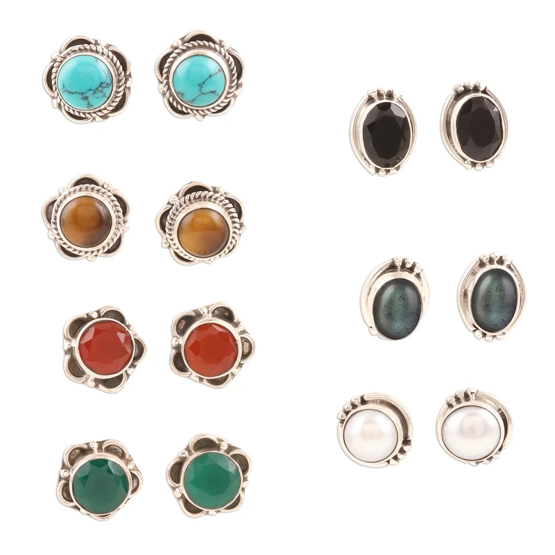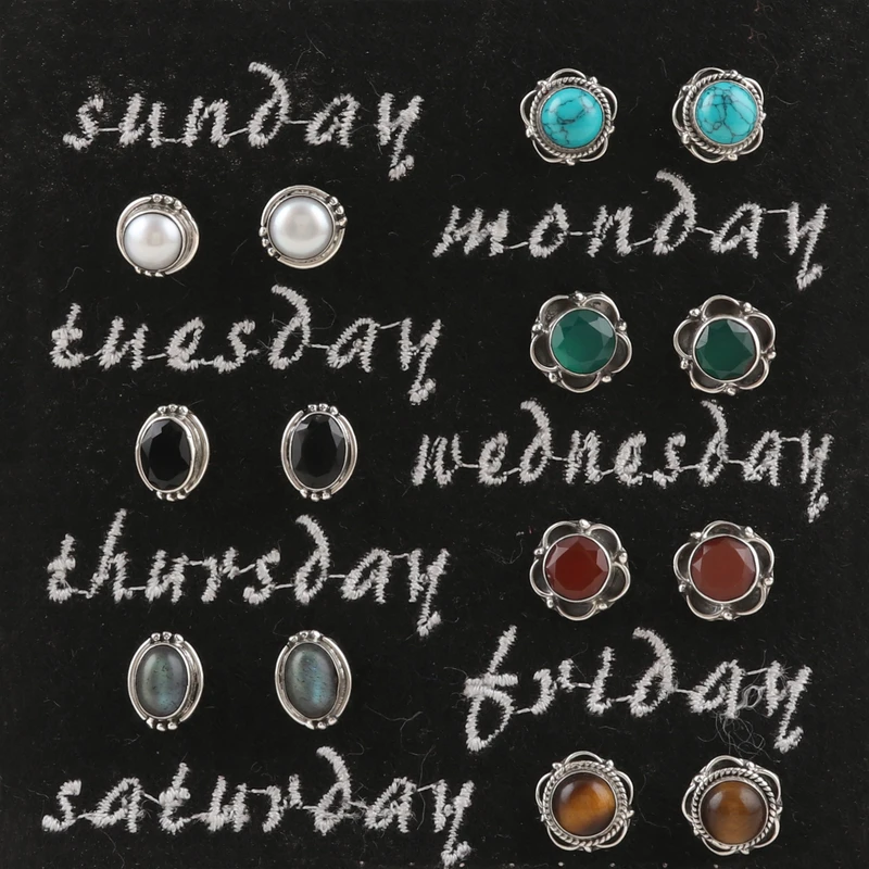 Framed by handcrafted sterling silver designs, various gemstones are displayed in this set of seven stud earrings from India. Bhavya Jain works with green and black onyx, carnelian, labradorite, tiger's eye, composite turquoise, and cultured pearl to create this set, which arrives with a felt patch that is embroidered with the days of the week; store your earrings on this patch that also provides a fun way to wear each one!