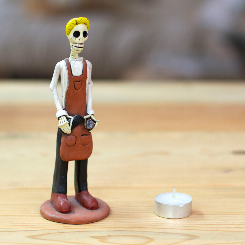 With a nod to José Guadalupe Posada's "La Calavera Catrina", Mexico's Jorge Escamilla creates this unique sculpture. Wearing an apron and a trendy hairstyle and carrying clippers, the skeletal barber is crafted of clay and steel wire. The original "La Calavera Catrina" was a zinc etching created by the artist José Guadalupe Posada in Mexico around 1910. Posada created the character, a female skeleton with an elegant hat, as a satirical portrait to lampoon Mexican natives who aspired to European style and denied their own heritage. The catrina has since become an emblem of Mexico's Day of the Dead celebration and a popular folk art subject.