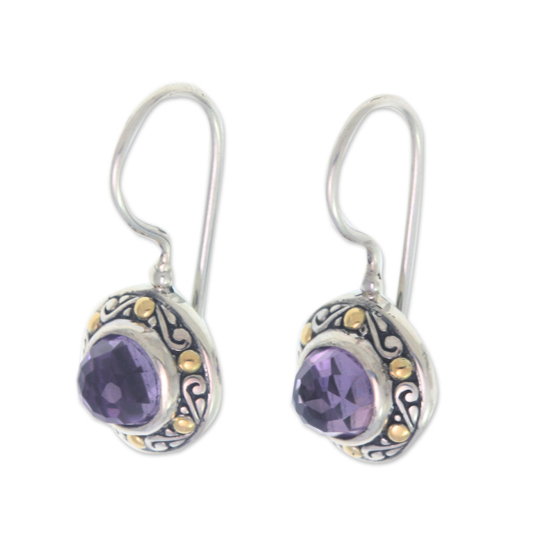 These earrings of infinite elegance are designed by Lenny. The earrings exude Balinese artistry; they are crafted by hand with sterling silver and 18k gold plated accents. Faceted amethysts are resplendent in these earrings.
