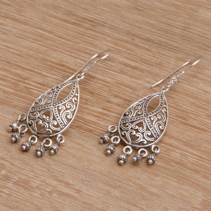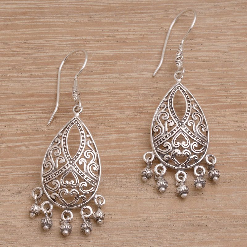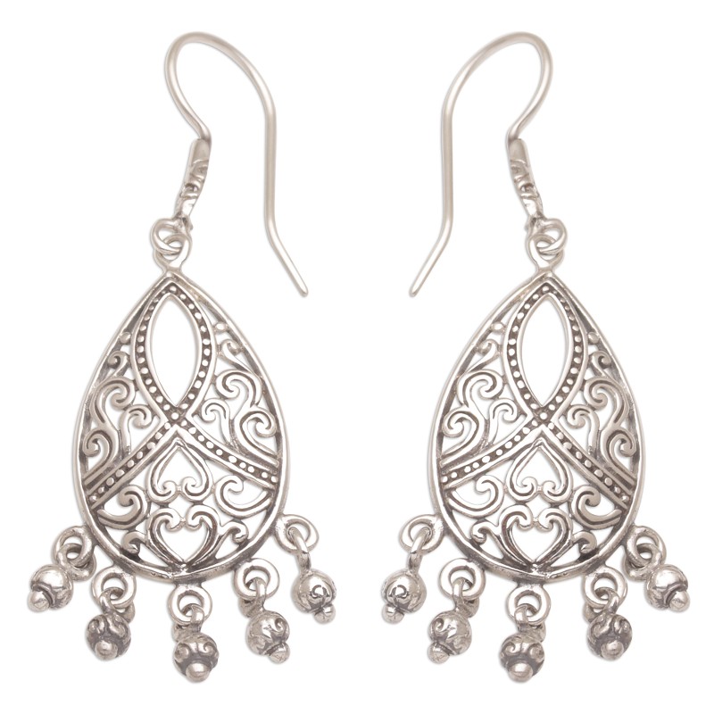Putu Putri of Indonesia presents this pair of 925 sterling silver earrings with in intricate heart and vine motif. Each pair of earrings is hand crafted and features one prominent, tear drop shaped sterling silver design with a beautiful motif, along with five hanging sterling silver balls, evoking a swinging chandelier of sterling silver.