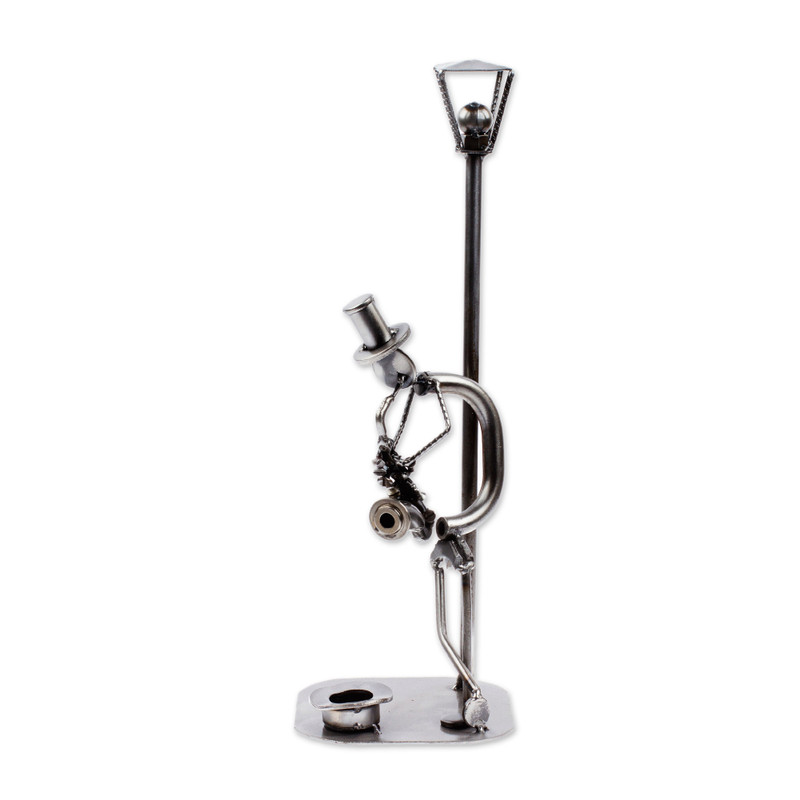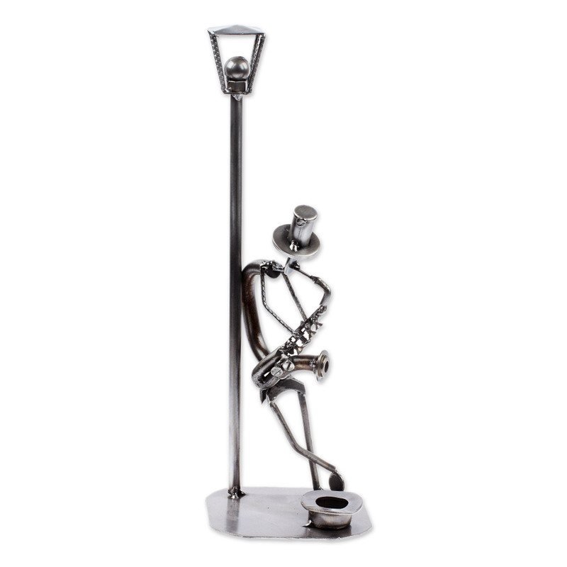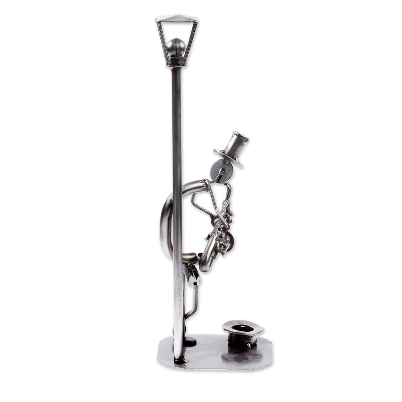 Leaning against a street lamp, a musician plays a sultry melody on the saxophone. This charming virtuoso is crafted from an amazing assortment of bicycle and automobile parts. Armando Ramírez recycles them as rustic art.