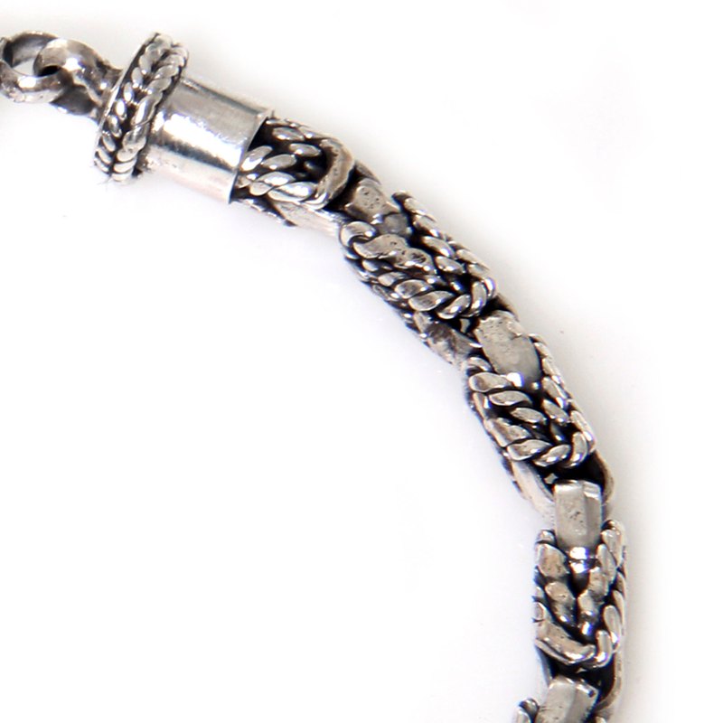 Komang Suastra evokes a sinnet braid with this beautiful bracelet. Juxtaposing rich silver textures, he handcrafts a classic design.