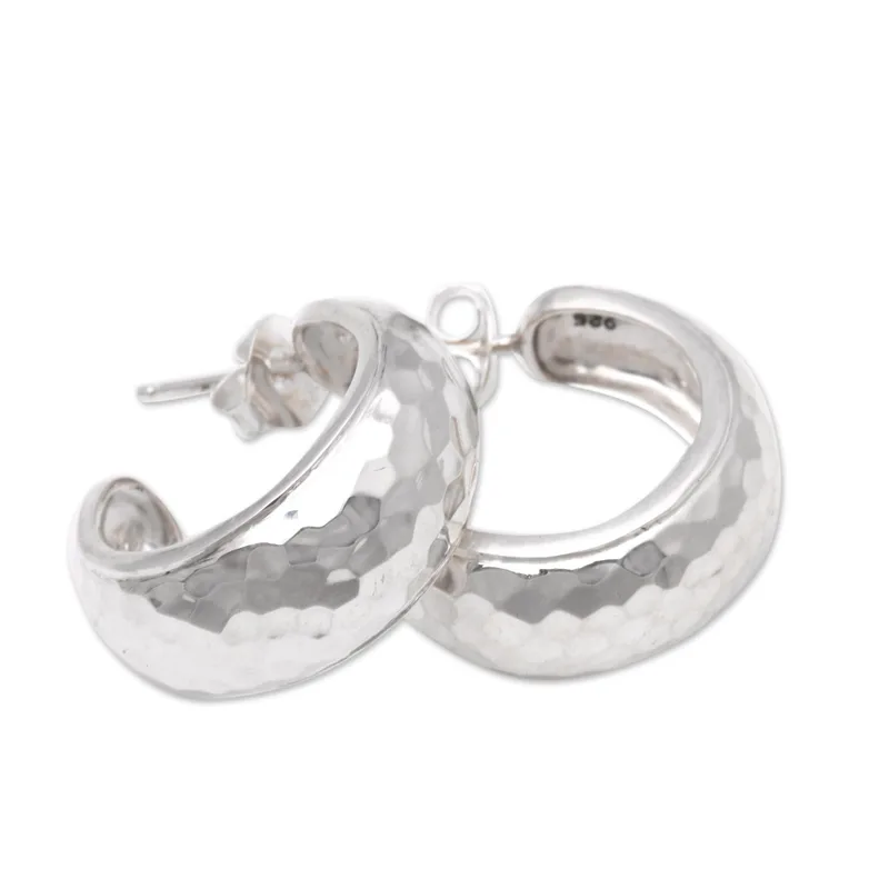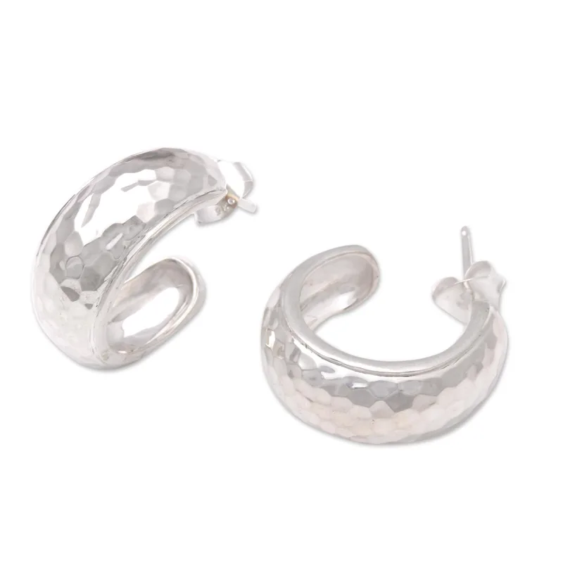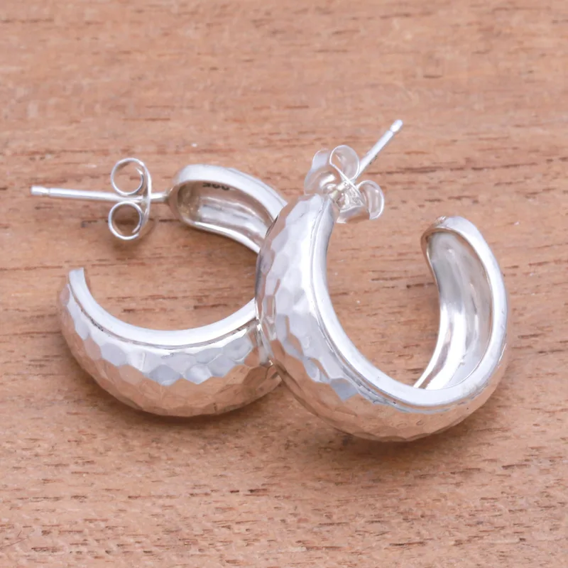 Crafted by hand, these earrings reveal a radiant glow. Hammered textures enhance the wide half-hoops by Nyoman Ariawan. The Balinese artisan works in sterling silver.