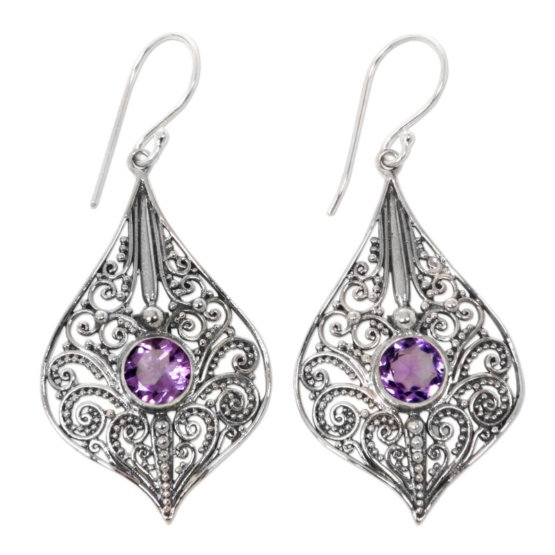 Lacy wire and beadwork in the traditional Balinese style forms a pretty background for lilac gemstones. Komang Suastra of Bali crafts the dangle earrings from sterling silver and adds 2.5 carats of sparkling faceted amethyst in this feminine design.