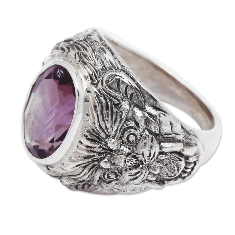 You can find our amethyst men's ring 'Benevolent Barong' by Nyoman Rena in jewelry categories such as Hinduism Rings, Birthstone Rings, Amethyst Rings, Silver Rings and Sterling Silver Rings. Enjoy exploring these sections for other Novica treasures.