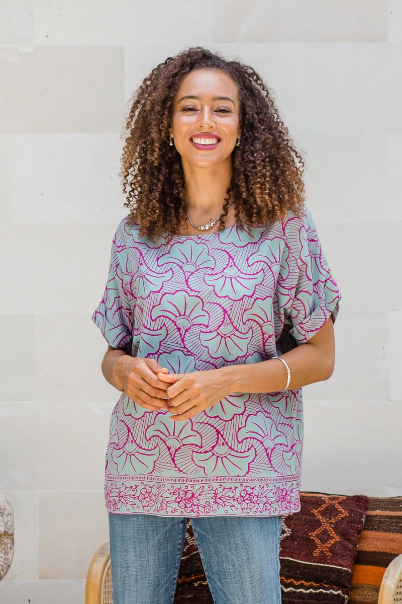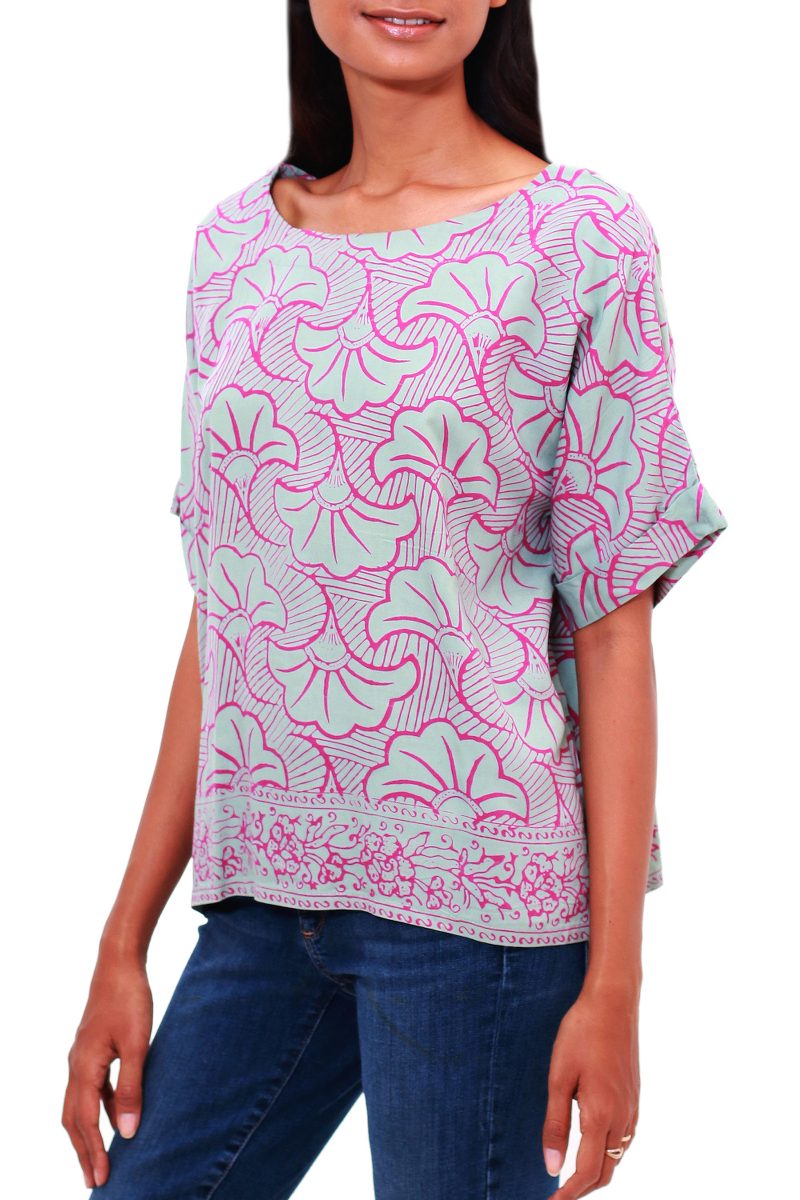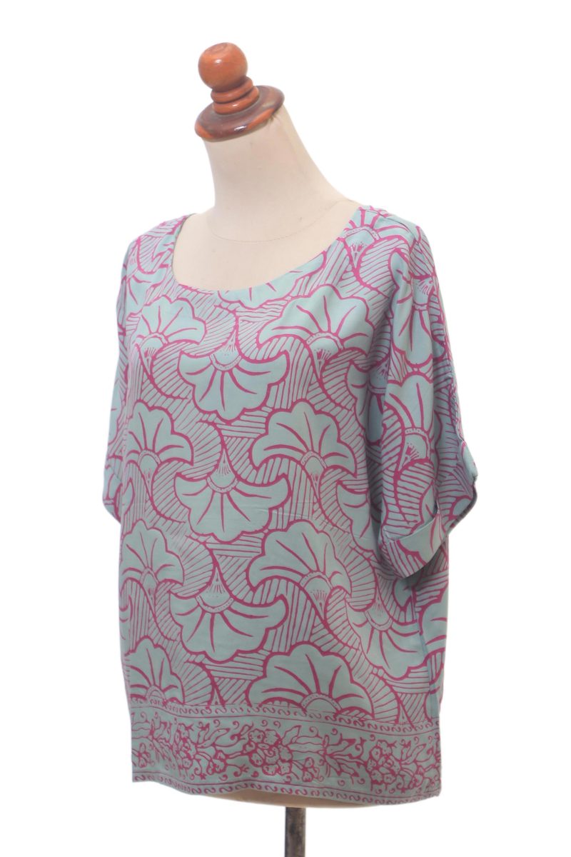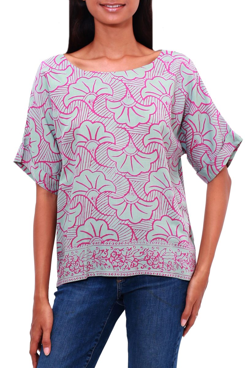 Inspired by fall, Balinese artisan Endah creates this lovely top. Crafted from smooth rayon, this shirt is decorated using the batik method; a wax resist is stamped by hand onto the fabric before it is treated with colorful dyes, resulting in entrancing mint green and magenta leaf motifs. A boat neck and cuffed short sleeves lend it a flirty look.