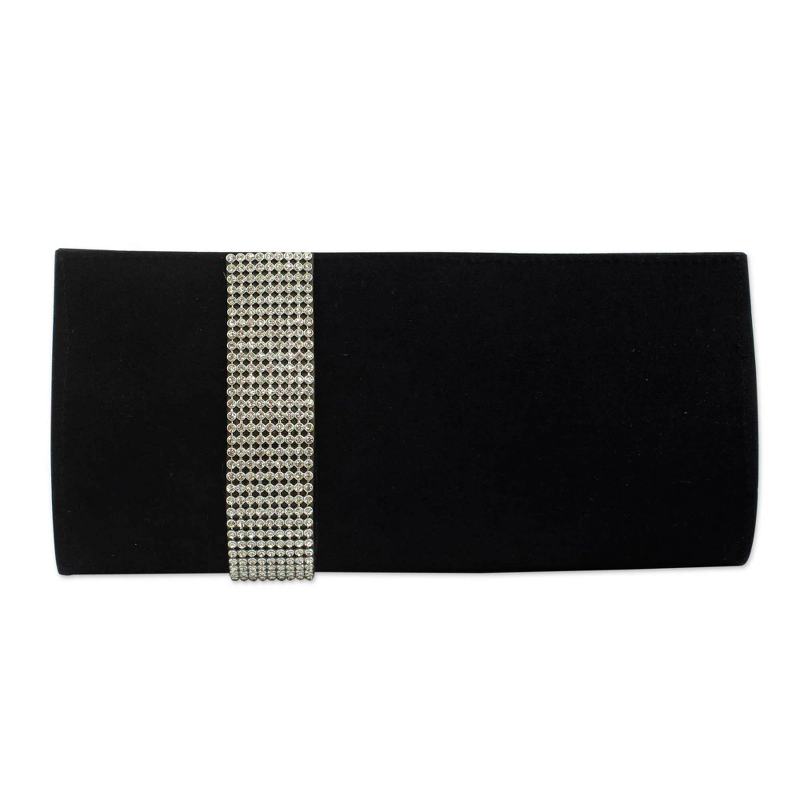 Chic and beautiful, this evening bag is enveloped in a sparkling rhinestone embrace. Vipin selects black polyester suede for the design and adds an inner zipper pocket.