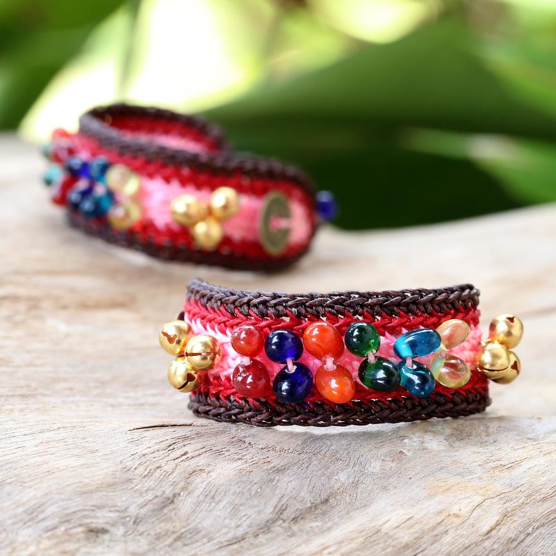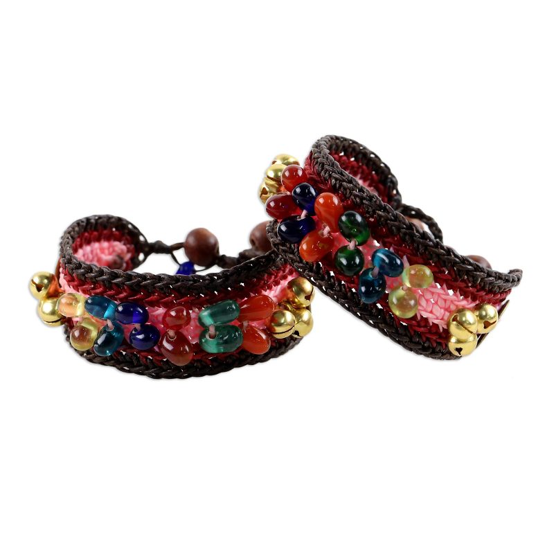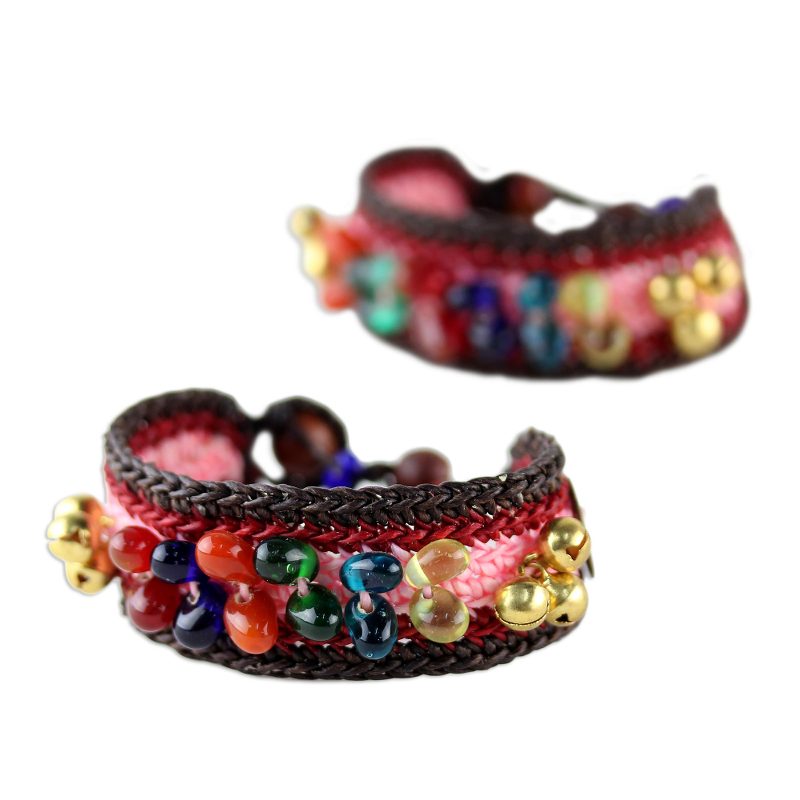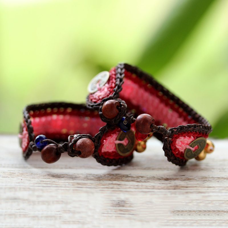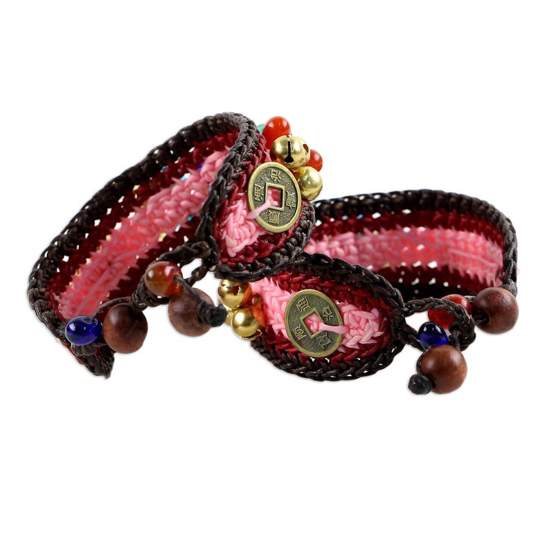 Thailand's Tiraphan Hasub casts a spell of bold elegance with the design of these bracelets. They are crocheted by hand featuring brass bells as well as Chinese coin replicas, believed to foster wealth and success. The bracelets are centered by colorful glass beads and fasten with rain tree wood spheres. Brass bells ring for good fortune.