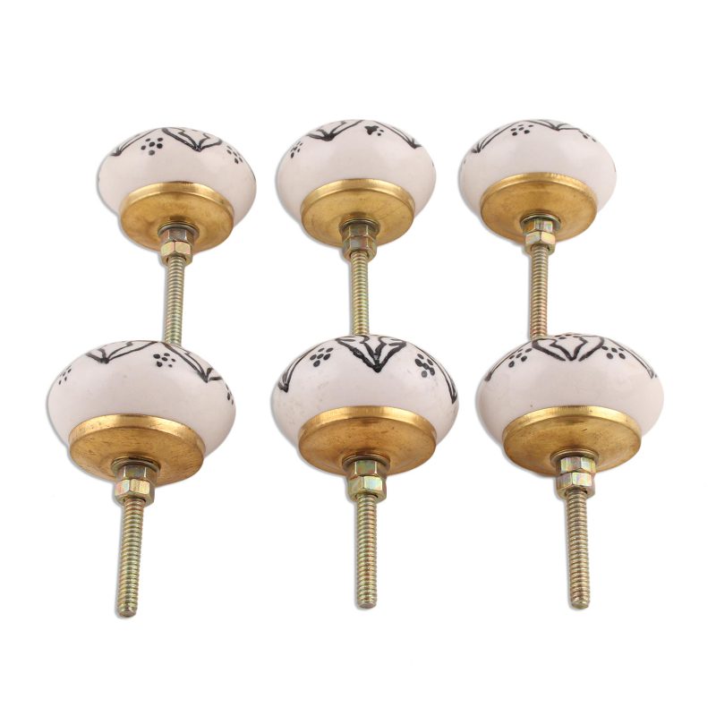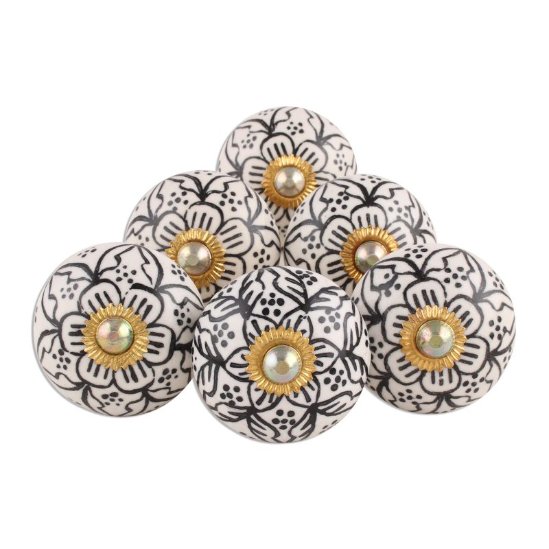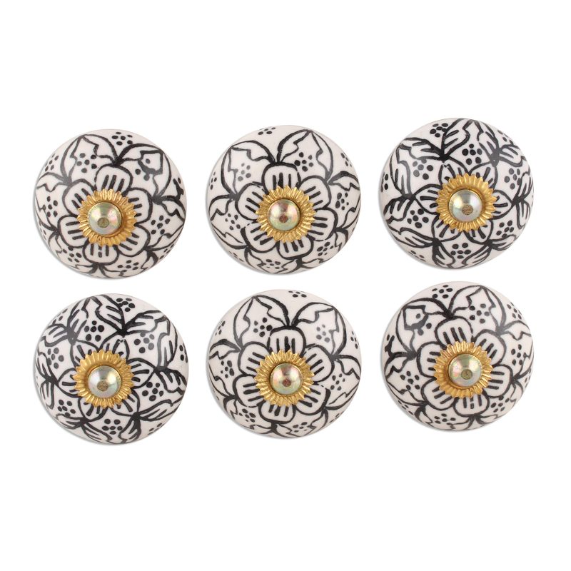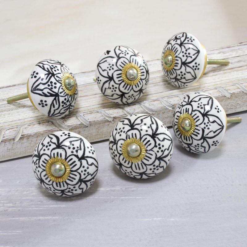 Painted by hand with intricate petals in black and white, six flowers make a charming addition to your home. India's Chirag Choudhary designs this set of knobs, completed with brass and iron fixtures.