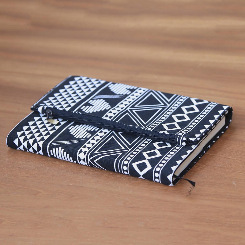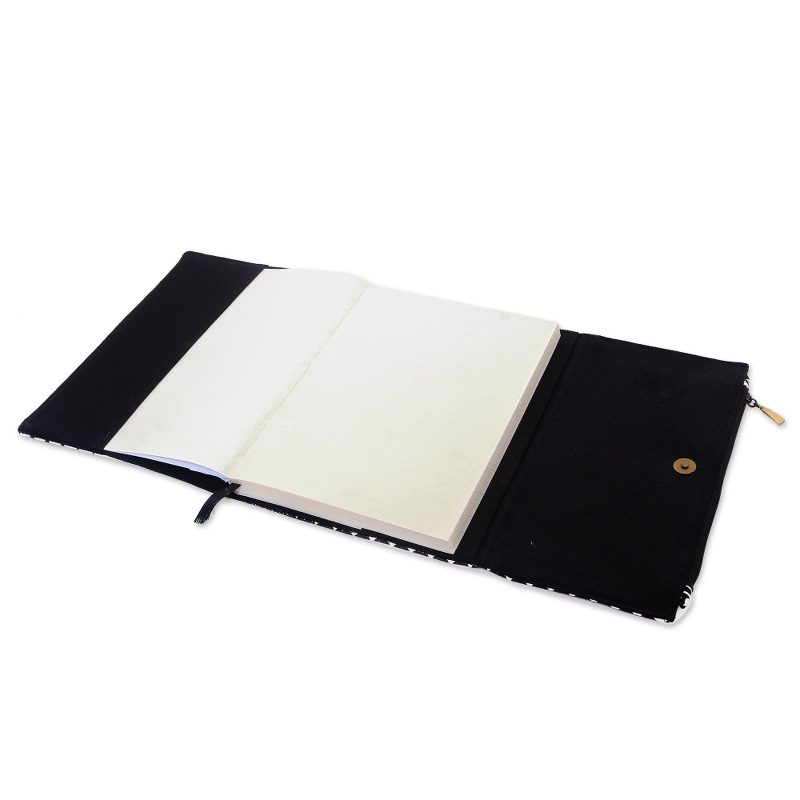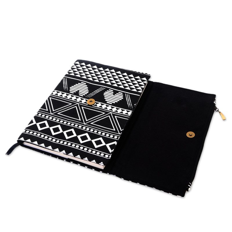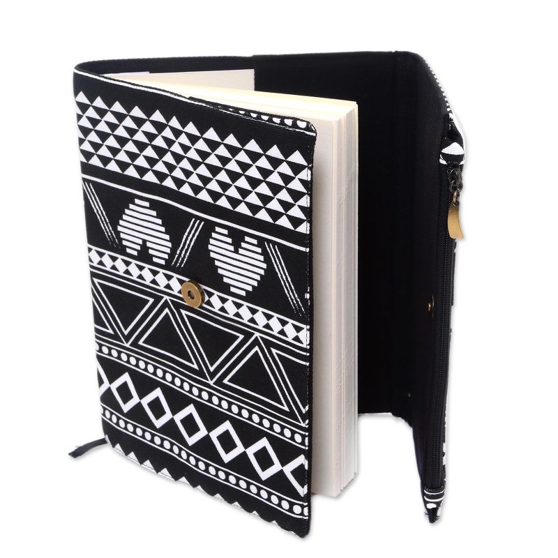Backed by our 100% Happiness GuaranteeThis handcrafted journal, thoughtfully designed by Hari Ratih of Java, has everything you need to organize your thoughts. With a cover made of black and snow white cotton with stripes of geometric and heart-shaped motifs, the journal has 200 unlined pages of recycled paper for your writing pleasure, with a black ribbon bookmark attached to help you find your place quickly. The cover has a fold-over flap that keeps the journal secure with a magnetic snap closure. The flap is also a pocket with a zipper across the edge, providing the perfect place to hold pens and pencils.