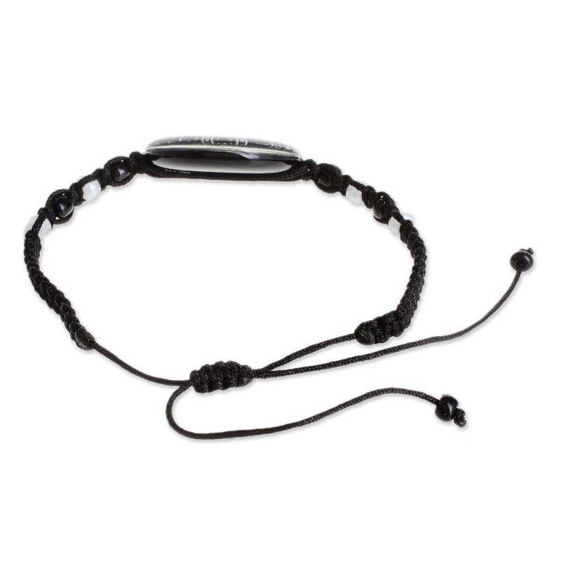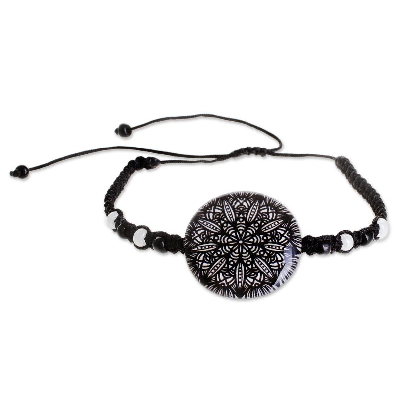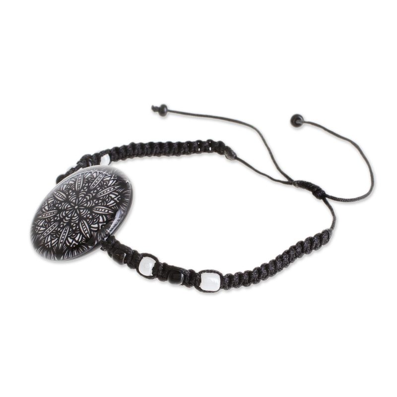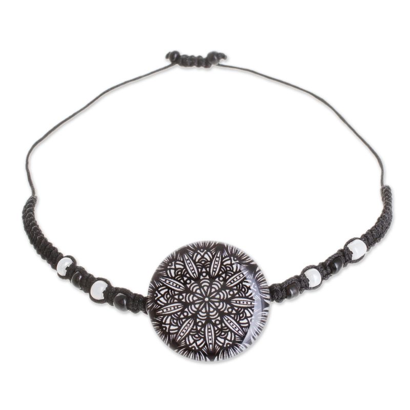 Delivery EstimatePrinted onto paper and coated in resin, elegant and intricate motifs in black and white decorate the pendant of this bracelet from Costa Rica. Katherine Vargas designs the bracelet, which circles the wrist with a handcrafted macrame band. Glass beads of black and white accentuate the pendant and the adjustable sliding knot.
