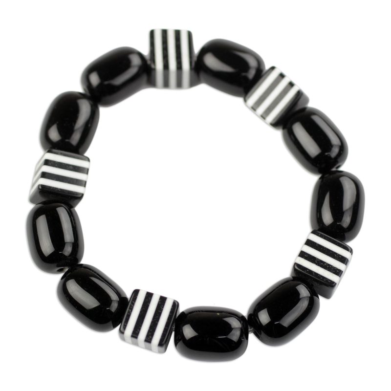 Interesting styled bracelet and very wearable at any time. A perfect weight and fit. Very comfortable to wear and I love the shiny black beads and the contrasting white striped squares. Its very fashionable and certainly a favorite for me! Thank you. Helen, Wales UK