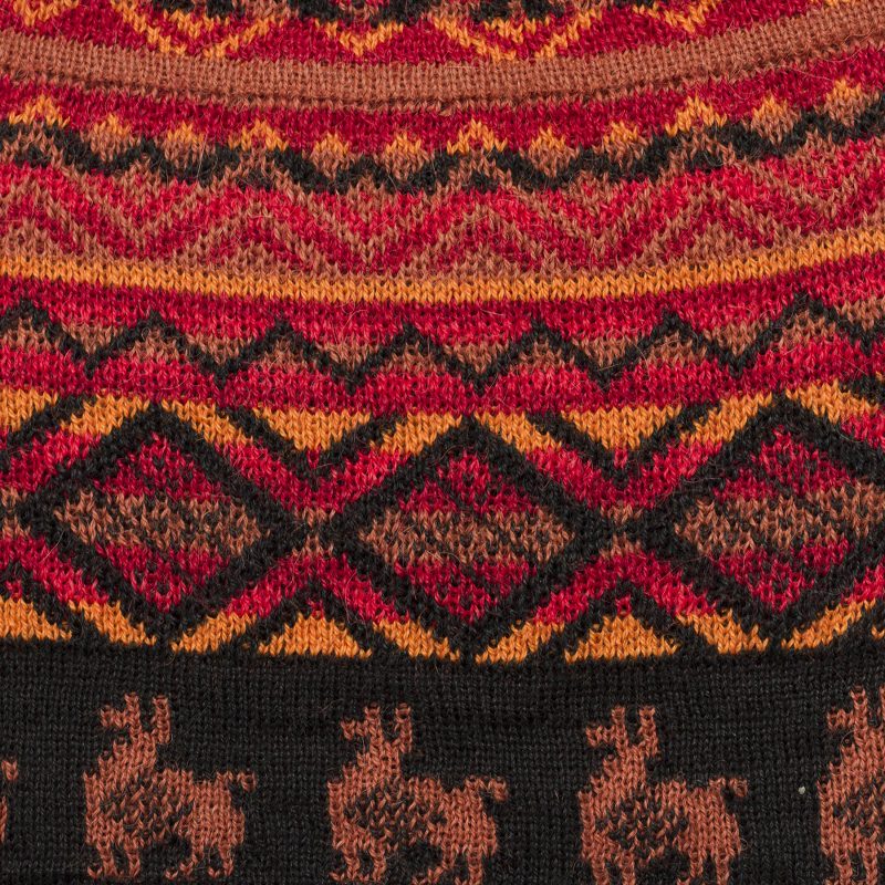 A parade of orange alpacas marches across the brim of this alpaca blend knit hat designed by Edison Canal of Peru. In apple red and tangerine orange on black, the body of the hat features rows of intricate diamond motifs.