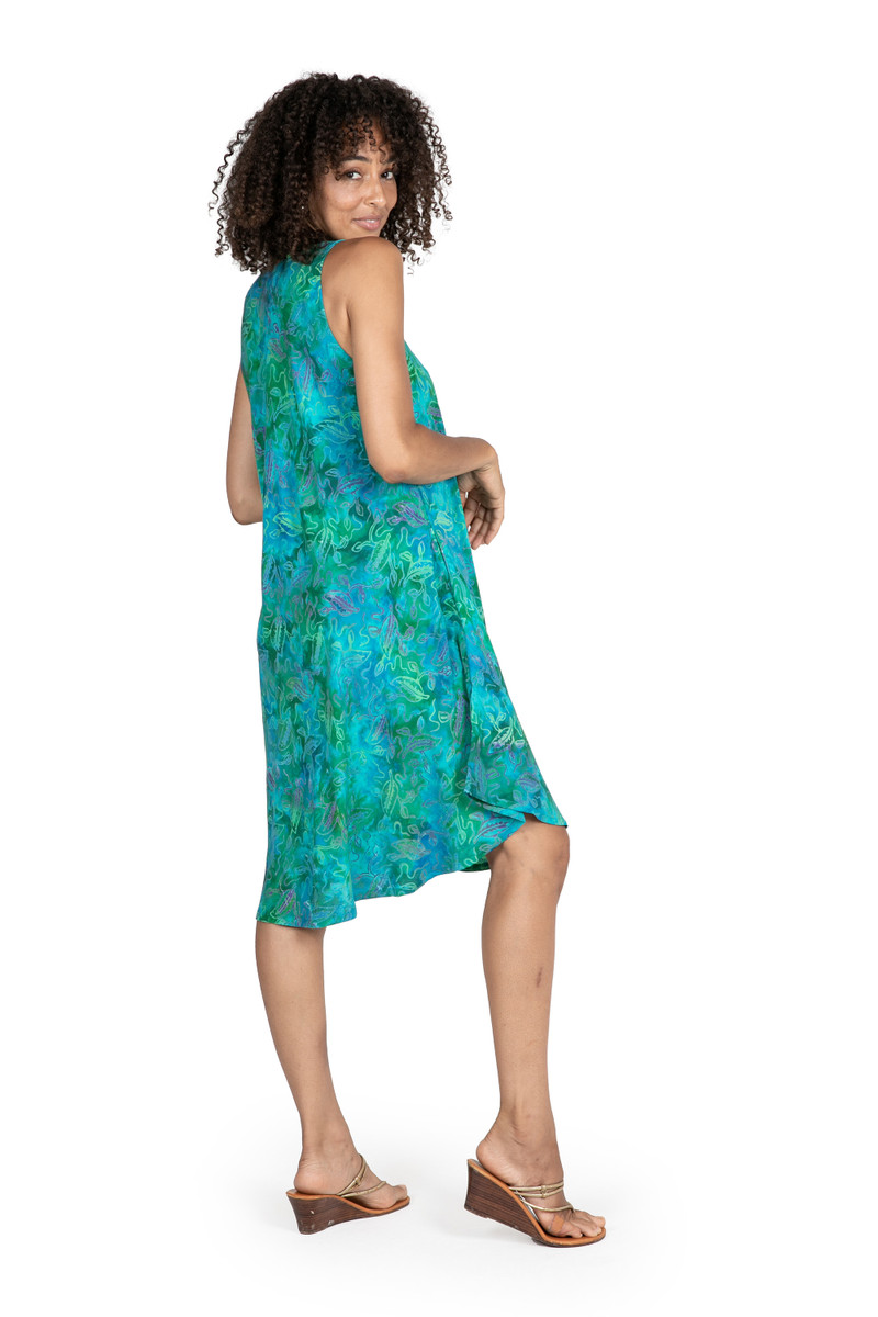 Desak Nyoman Parwati creates a stylish sleeveless dress that evokes the beauty of a leafy forest path in Bali. Blue and green leaves are created through a traditional hand-stamped batik process on tie-dye fabric for rich and complex color nuances. Ideal for casual wear to the market or for a stroll, the versatile design features convenient side pockets.