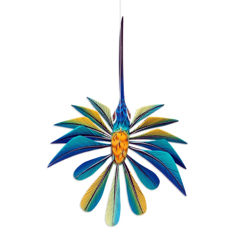 A playful hummingbird soars skyward in an alebrije sculpture designed to hang from the ceiling. Zeny and Reyna transform found pieces of copal wood into a delightful alebrije. These fanciful sculptures are a traditional folk art in Oaxaca, once based on twenty totems but today representing all kinds of animals. They take their name from a Caló gypsy word for "something difficult, tangled, confusing or fantastic."