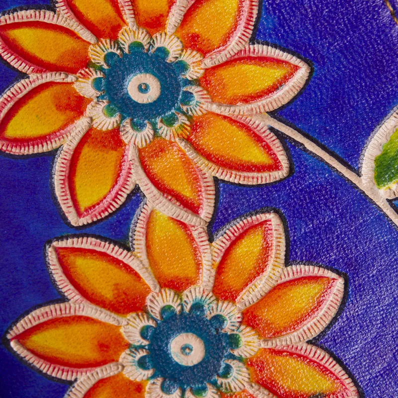 Two sunny, hand painted flowers bloom on the front of this blue leather passport cover designed by Kathiana Quispe of Peru. The back is solid blue and inside are two transparent sleeves to hold your passport securely in place.