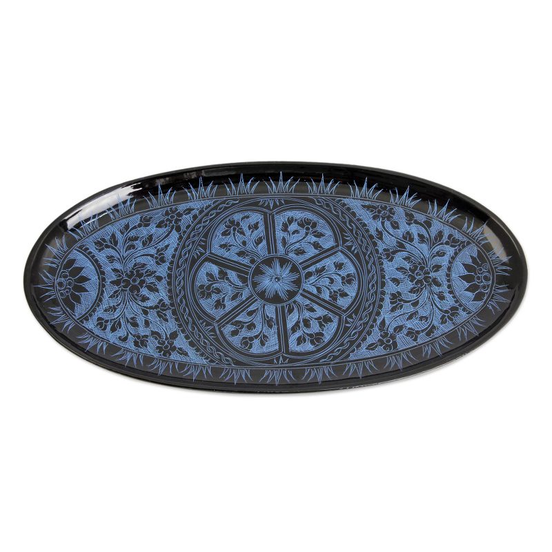 A floral medallion centers this lacquered wood catchall tray from Thailand. By Nantana Sompamitre, the detailed artistry on the tray is etched by hand and painted blue, creating a marvelous effect.