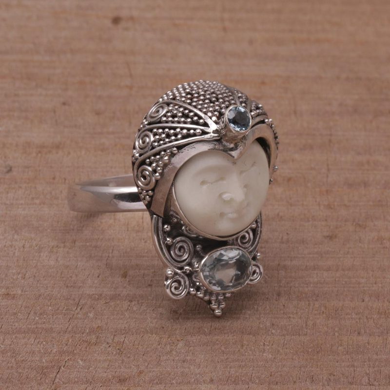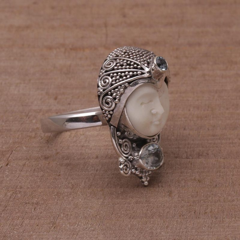 This cocktail ring from Balinese artisan Komang Suastra is named after the village of Celuk, which has produced remarkable silver works for decades. A regal, peaceful face carved from bone is encased in a sterling silver helmet decorated with Balinese jawan style dot motifs. Two faceted blue topaz gems adorn the ring, one at the fore of the helmet and a larger stone at the base.