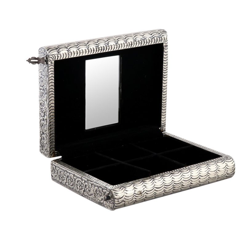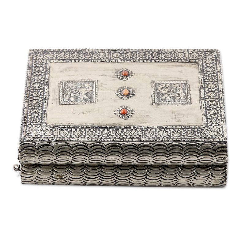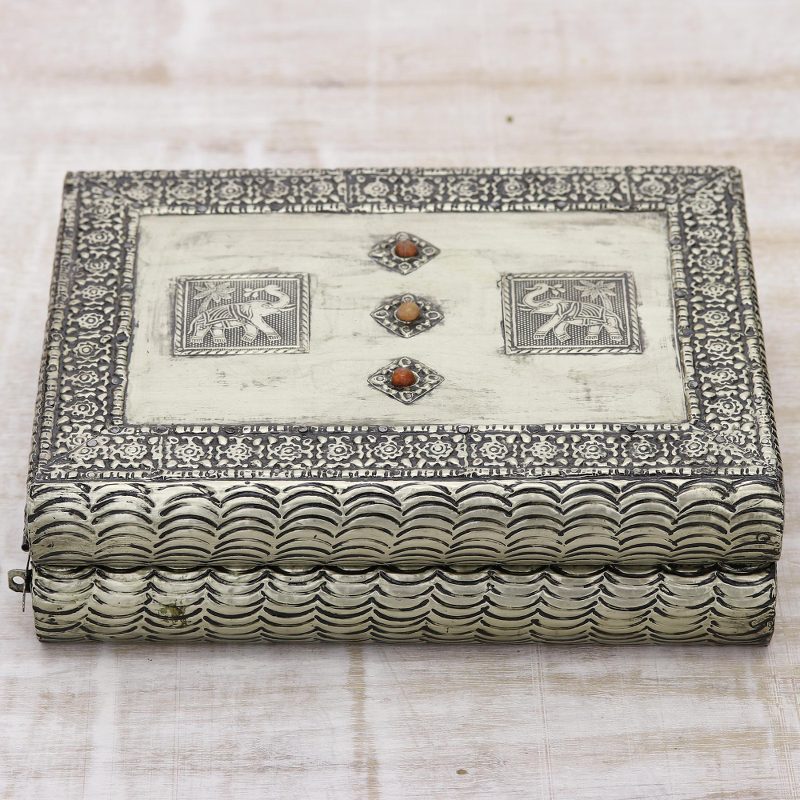 Floral motifs surround two royal elephants on a sumptuous coffer. Handcrafted of mango wood, this jewelry box by Khalid Ali is covered in embossed brass bathed in nickel. He creates six velvet-lined compartments and adds a mirror in the lid.