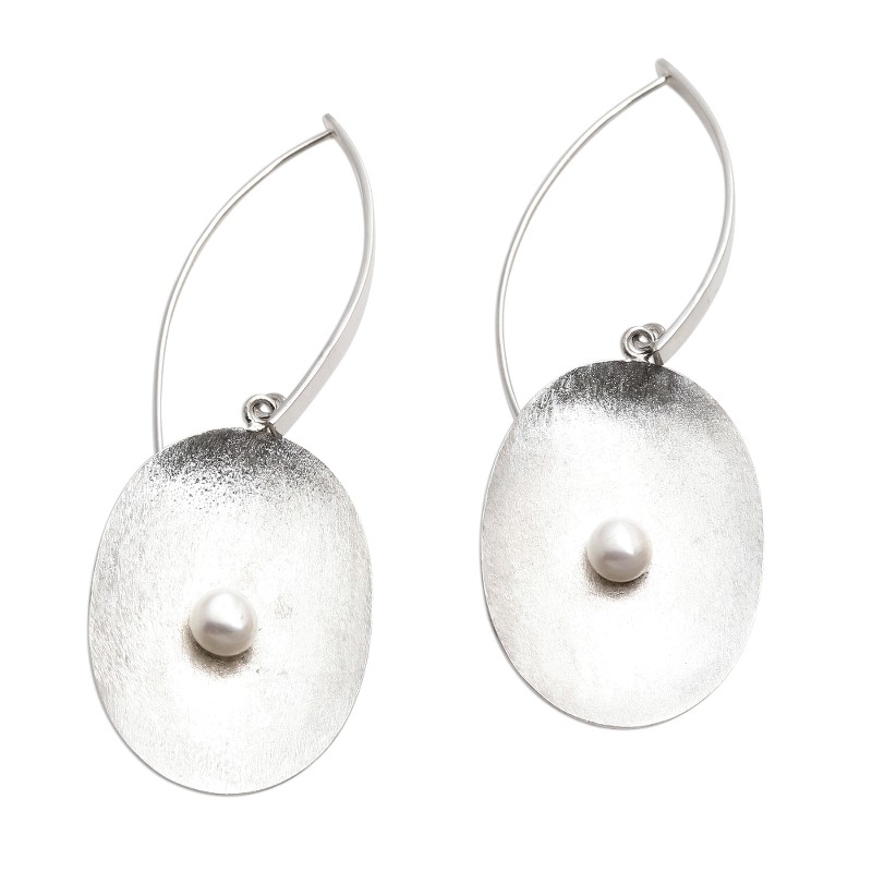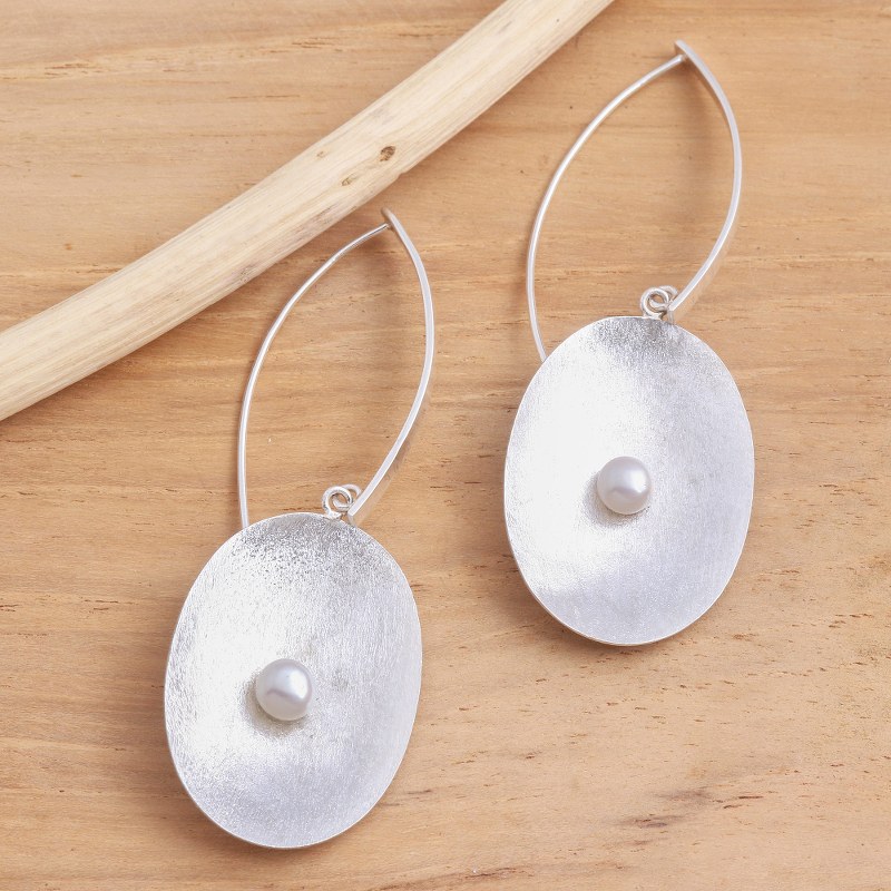 Oval-shaped brush satin cups of sterling silver cradle solitary cultured pearls in these dangle earrings by Bali's Budiharta. The earrings serve to remind us that everything--everything we know and love--begins from a tiny seed, a passing thought, or an idea that must be nurtured in order to realize its full potential in life.