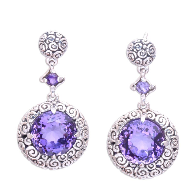 Caught in clouds of moonlight, enhanced amethyst is dazzling. Zayd Makarim designs these exquisite earrings, suspending them from a globe and a smaller violet gem. Makarim takes his inspiration for the spiral motifs from the tight curls on Buddha images.
