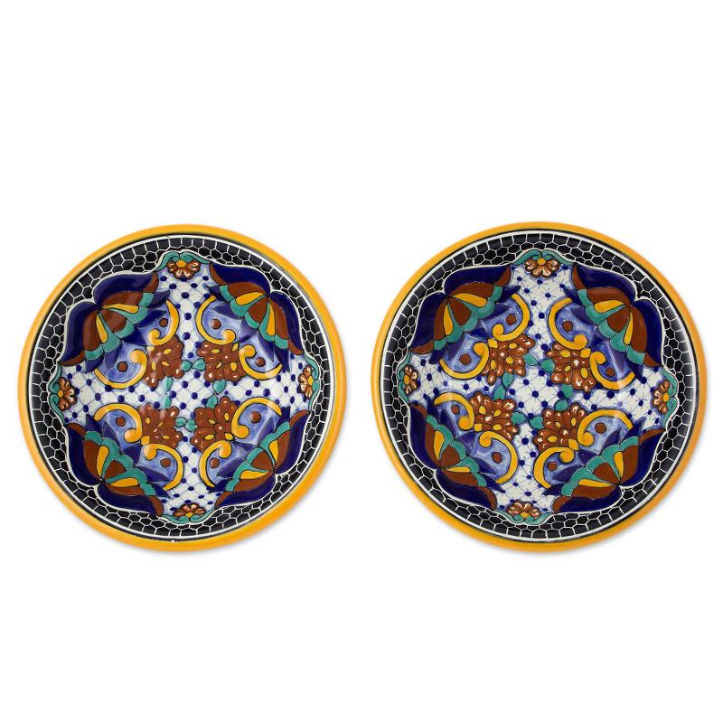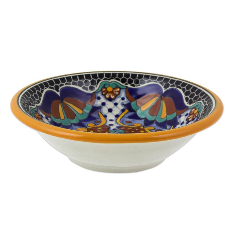 Delivery EstimateFlowers blossom with an exuberant feast of colors on soup bowls designed in the Talavera style of the state of Puebla. The motifs are painted by hand over the ivory-color ceramic bowls with a palette that includes yellow-orange, blue, and green flowers over a crisscross network of dots and crosses. Bordered by a black honeycomb, this pair of bowls comes from the 'Zacatlán Flowers' collection designed by Pedro Tecayehuatl.