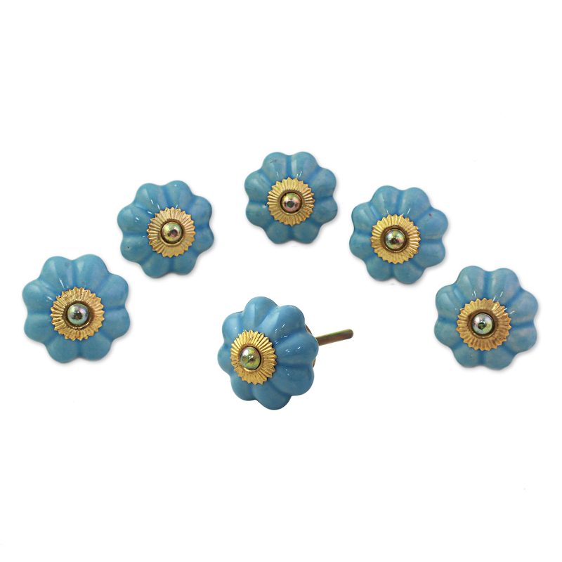 India's Khalid Ali handcrafts this set of six ceramic cabinet knobs. Featuring a floral design in sky blue, these charming and helpful knobs make an excellent addition to any drawers or cabinets.