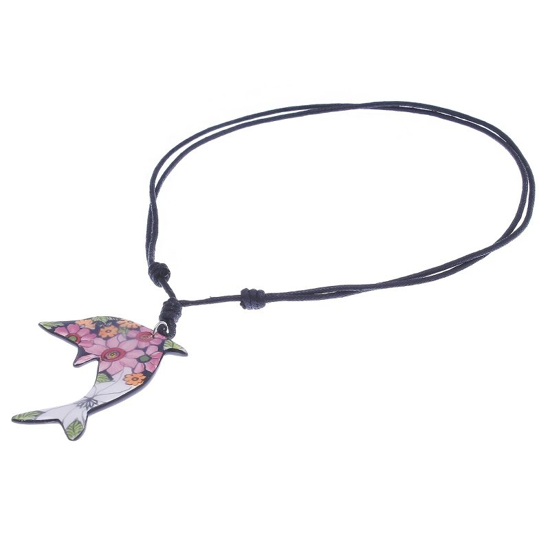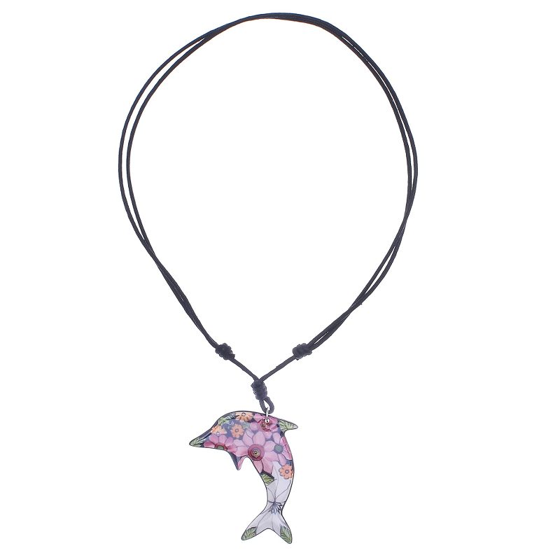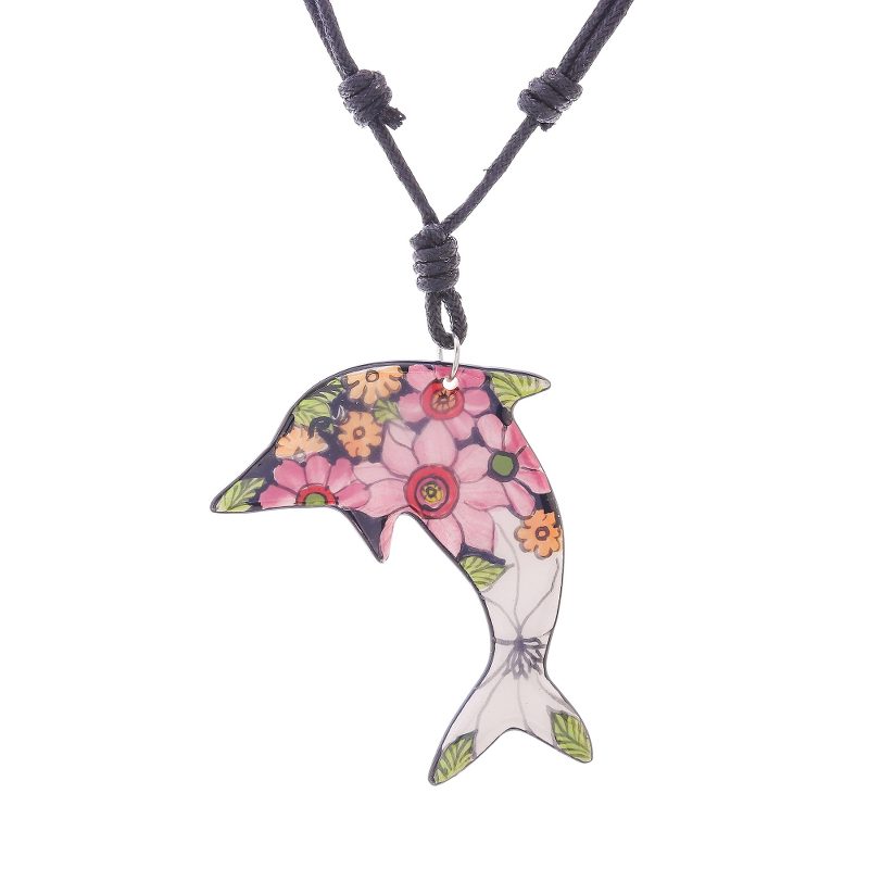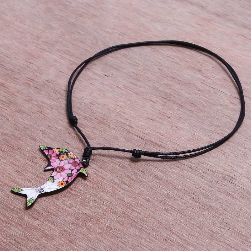 Paying homage to one of the ocean's friendliest mammals, Thai artisan Napat Chotpruekchookul creates a pendant necklace of floral beauty. Cotton cord, adjusting with a sliding knot, encircles the neck. The cord is centered by a ceramic pendant in the shape of a dolphin, its surface painted by hand with a bouquet of spring floral motifs.