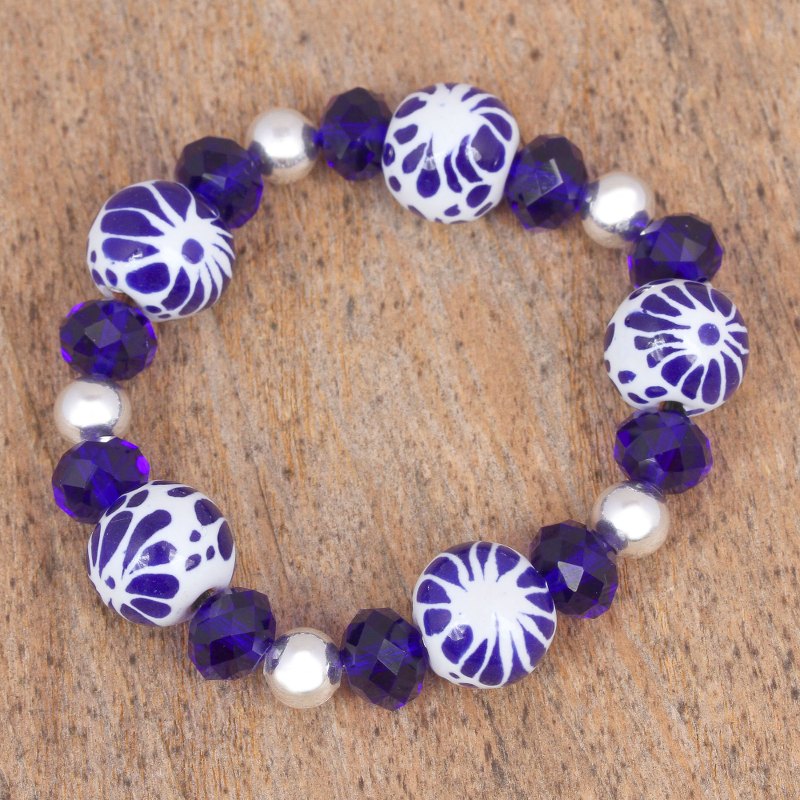 Artisan Monica Vazquez of Mexico hand crafts this lovely stretch bracelet with Talavera-style ceramic beads painted with a beautiful deep blue floral motif, matching crystal beads, and sterling silver beads. About her work, the artisan says: "I have a deep admiration and love for everything that has been done in Mexico. I love that with these designs we give women beautiful accessories and highlight Mexican craftsmanship."
