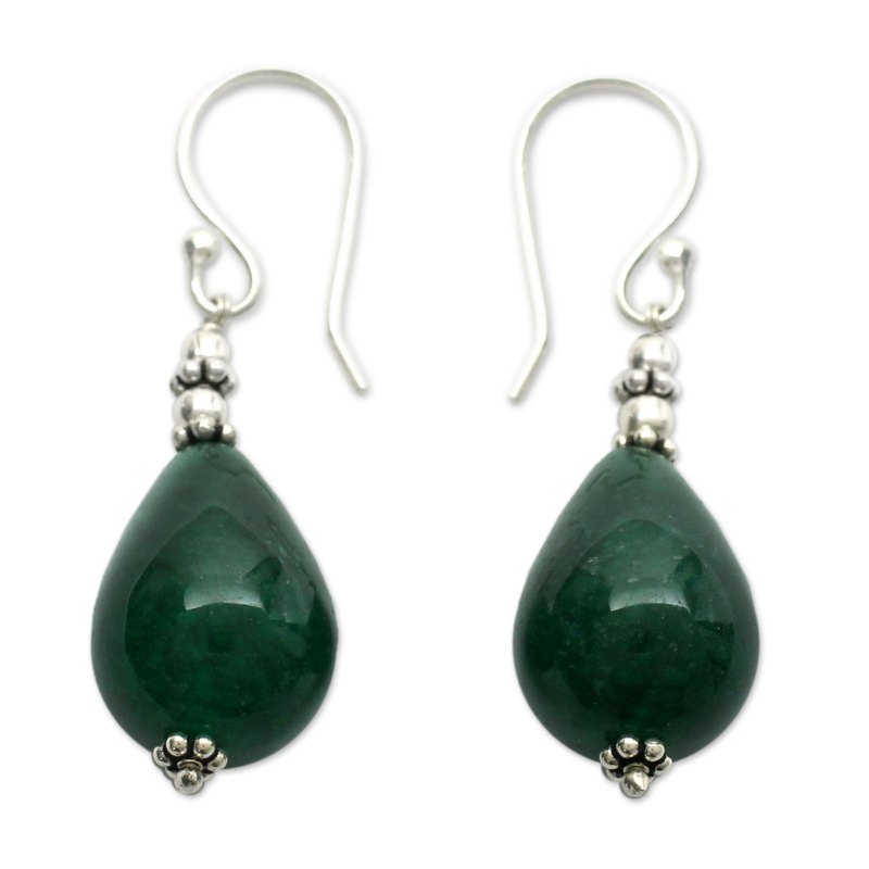 Sleek, emerald green and beautiful, a dewdrop of polished chalcedony distinguishes elegant earrings. The original design by Narayannii is handcrafted of sterling silver.