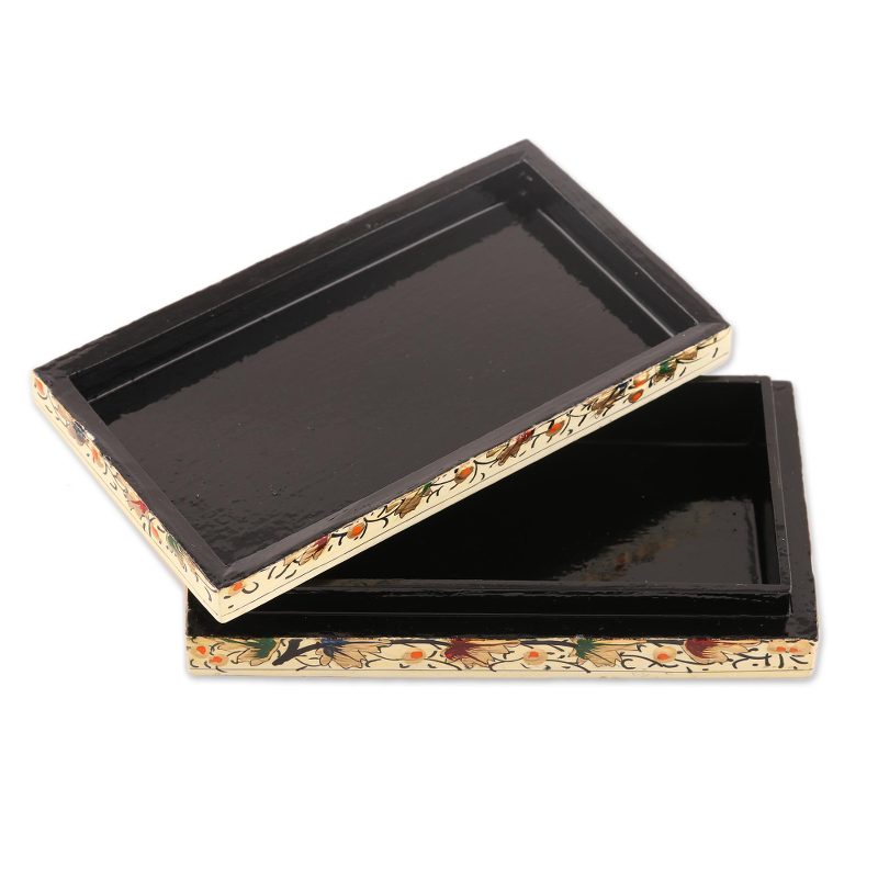 A black chinar tree with golden leaves is diligently painted by hand onto the exterior of this rectangular decorative box from India. Mohammad Hussain Baba creates this box, handcrafted of lacquered papier mache over weeping willow wood. The top lid lifts open to reveal a single-compartment black interior for storing small odds and ends.